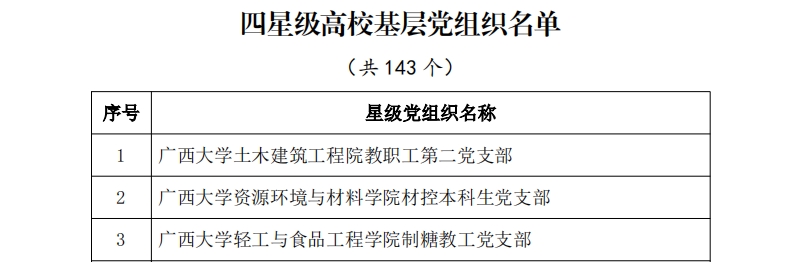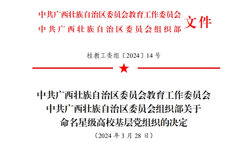 近日,《中共广西壮族自治区委员会教育工作委员会 中共广西壮族自治区委员会组织部关于命名星级高校基层党组织的决定》(桂教工委组〔2024〕14号)公布了星级高校基层党组织名单,beat365官网机电工程学院第一学生党支部、信息工程学院第二学生党支部、商学院第二学生党支部获命名为自治区高校星级基层党组织。