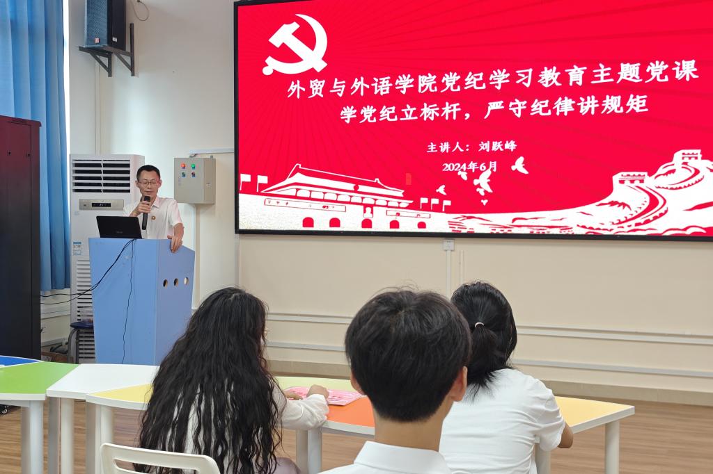 为推动清廉学校建设,引导广大青年遵规守纪,6月28日,学校副校长刘跃峰以《学党纪立标杆,严守纪律讲规矩》为题,在F110为外贸与外语学院全体学生党员及学生干部讲授了一堂生动而深刻的专题党课。