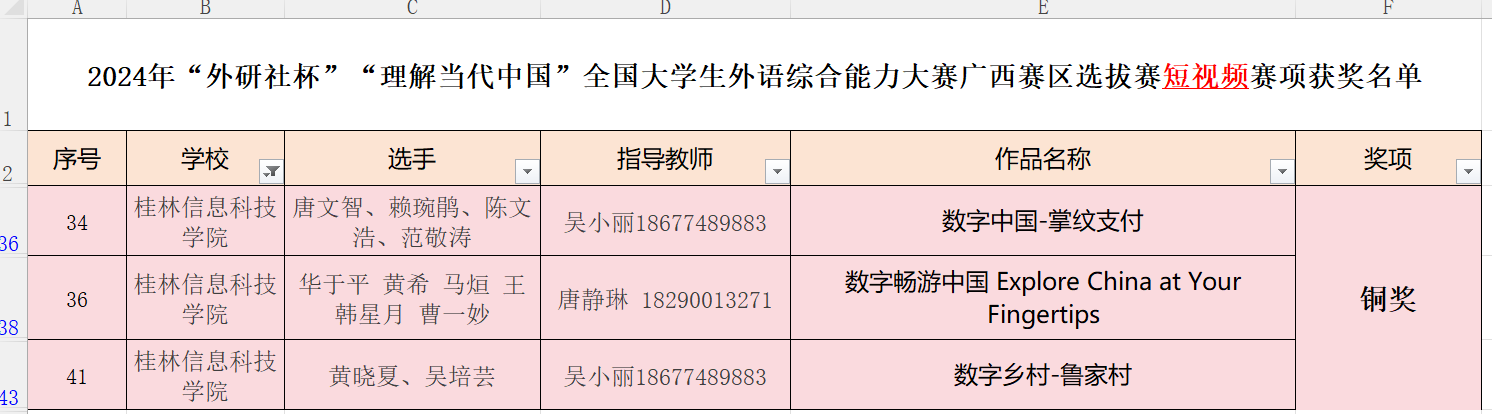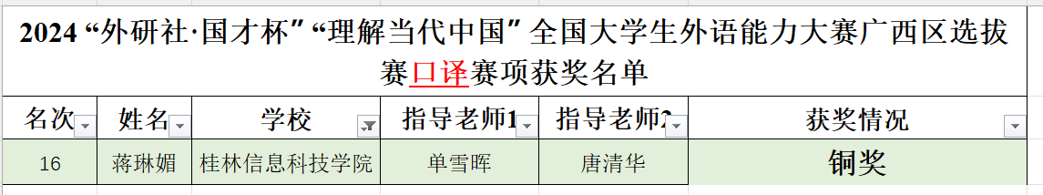 近日,2024年“外研社·国才杯”“理解当代中国”全国大学生外语能力大赛广西赛区选拔赛(以下简称区赛)圆满落幕。beat365官网外贸与外语学院学子在区赛中表现优异,共荣获铜奖10项,其中国际传播综合能力比赛—读写译综合能力分赛项5项,英语组短视频赛项3项,口译赛项1项,国际传播综合能力比赛—演讲分赛项1项。