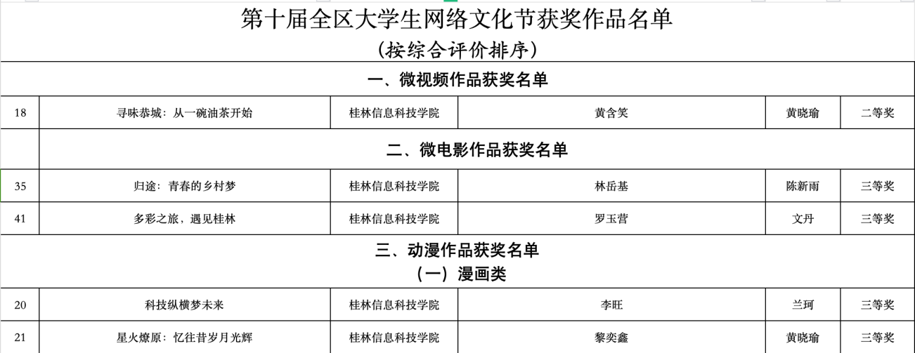 近日,由自治区教育厅和自治区党委网信办主办的第十届全区大学生网络文化节及2024年全区高校网络教育优秀作品推选展示活动获奖名单揭晓,beat365官网师生在微视频、微电影、公益广告、摄影、动漫、校园歌曲、其他类网络创新作品和优秀微课8类作品中获奖18项,其中二等奖5项,三等奖13项。