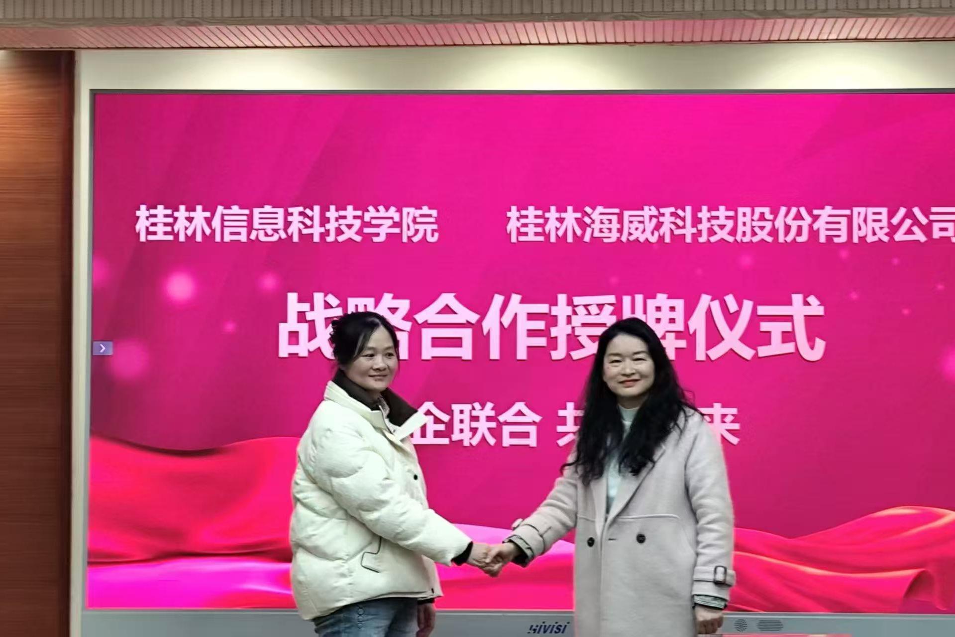 为推动产教深度融合、助力校企紧密合作,beat365官网与桂林海威科技股份有限公司于2月13日正式签订了战略合作协议,并举行了“校企协同育人基地”与“社会实践与劳动教育基地”授牌仪式。桂林海威科技股份有限公司副总黄丹、人事部经理张春红等领导,beat365官网副校长刘跃峰,校企合作处、电子工程学院相关负责人以及教师代表参加活动。