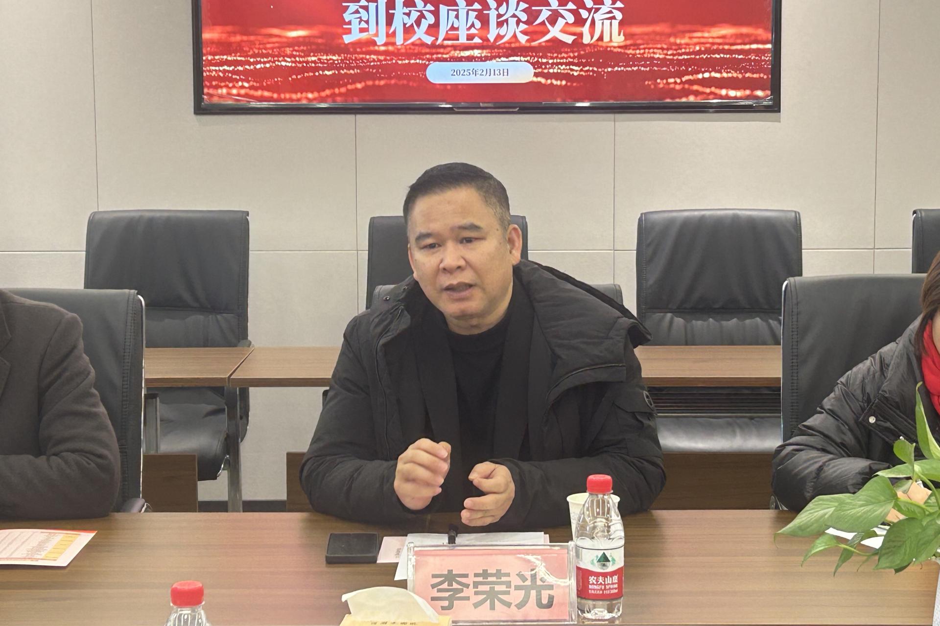 在座谈会上,副校长刘跃峰对李荣光副主任、徐光辉总经理一行来校交流表示热烈欢迎,他详细介绍了学校在人才培养、专业建设、就业与校企合作等方面的工作举措和成果。他表示,学校与桂林经济技术开发区的合作密切,希望以此为契机,政府牵线搭台,学校与比亚迪进一步加强沟通与交流,实现校企深度融合,将企业需求融入专业人才培养,为企业提供人才基础和智力支持,形成特色品牌,推动产业发展。双方围绕就业文化、企业资源、毕业生留桂等深入交流探讨,对学校2025届毕业生就业工作的后续合作模式等达成合作意向。