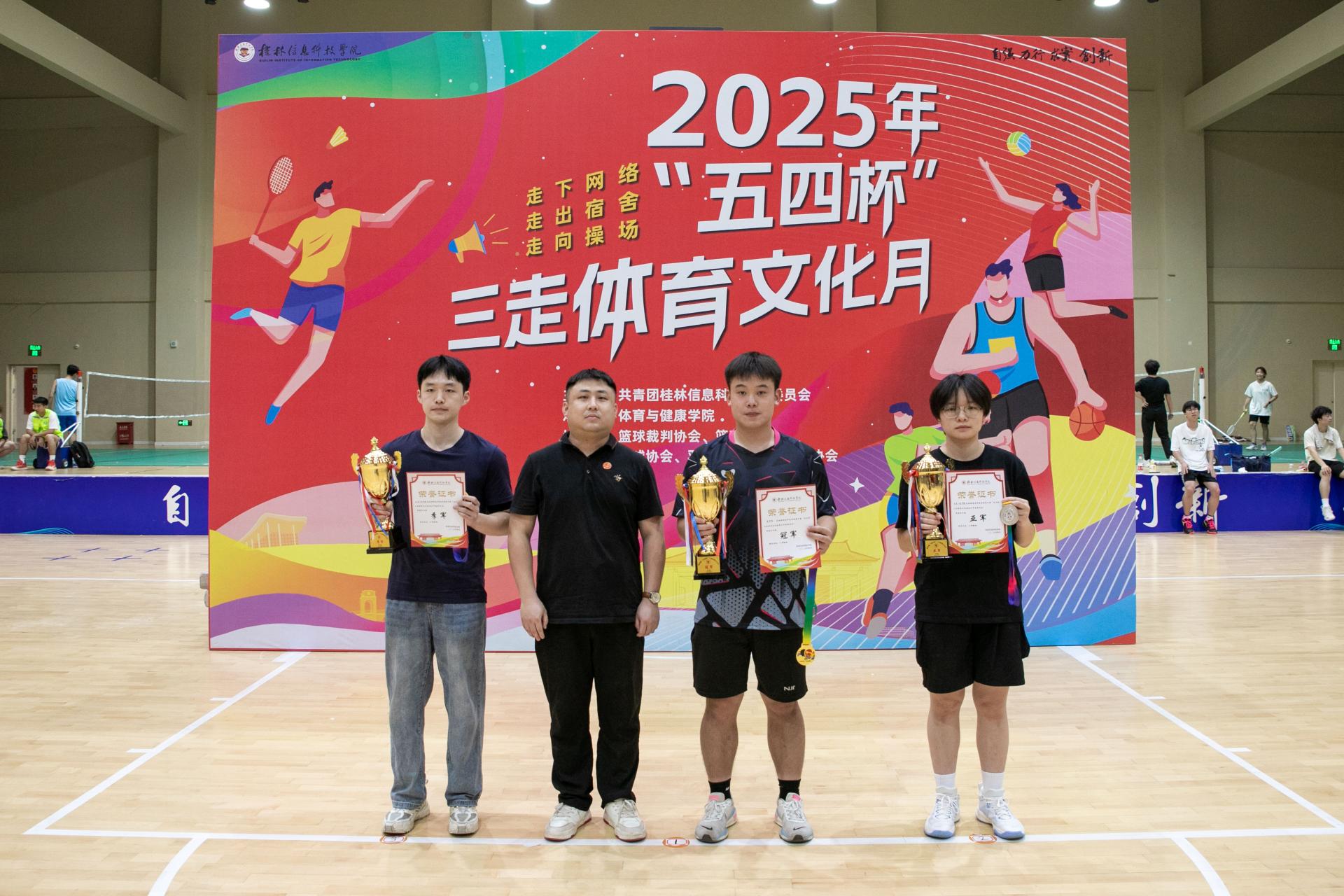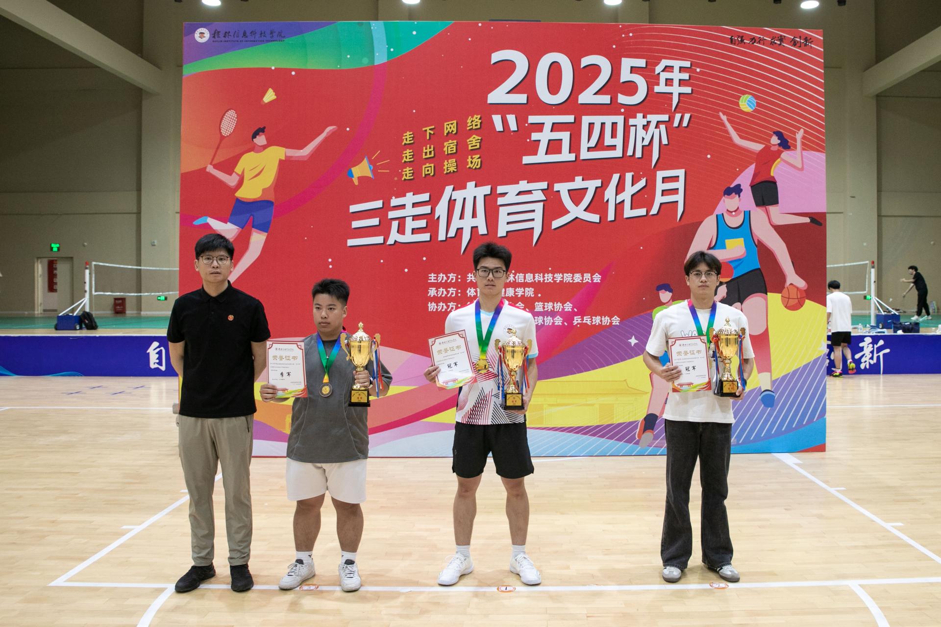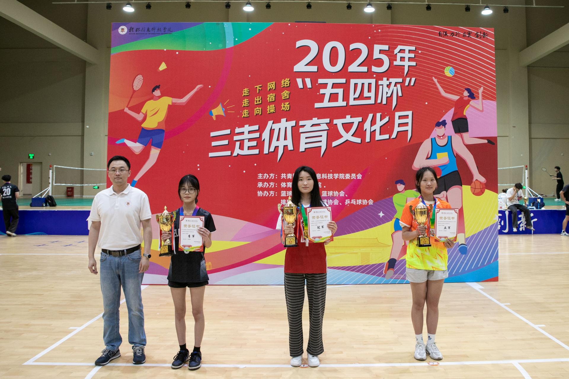 在激昂的音乐声中,闭幕式正式拉开帷幕。本届“五四杯”三走体育文化月精彩纷呈,涵盖羽毛球、乒乓球、气排球和篮球四大项目。自4月11日启动,历经十九天激烈角逐,全校7个学院、63支队伍、554名运动员踊跃参与,累计吸引10000余人次观赛,尽显信科学子积极向上的青春风采。
