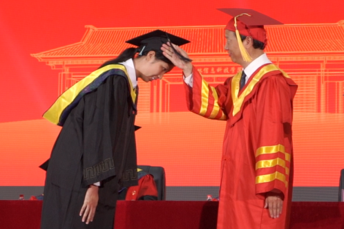 上午10点,典礼在庄严的国歌声中拉开序幕。副校长陈玲萍宣读学校授予普通本科毕业生学士学位决定。在毕业典礼学士学位授予仪式中,解庆林校长为毕业生代表一一拨穗、颁发学位证书。现场掌声不断,隆重而又不失活泼,上台的毕业生代表与校长亲切互动,分享毕业礼成的开心时刻,表达对母校的感激及不舍之情。