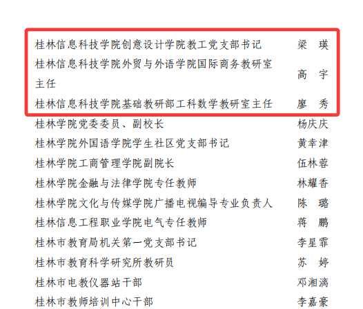 近日,桂林市委教育工作委印发《中共桂林市委员会教育工作委员会关于表彰2025年度桂林市直属教育系统优秀共产党员 优秀党务工作者 先进基层党组织的决定》(市委教工委〔2025〕25 号),学校党委获评“先进基层党组织”荣誉称号,廖星男等6名同志获评“优秀共产党员”荣誉称号,吕丽同志荣获“优秀党务工作者”荣誉称号!