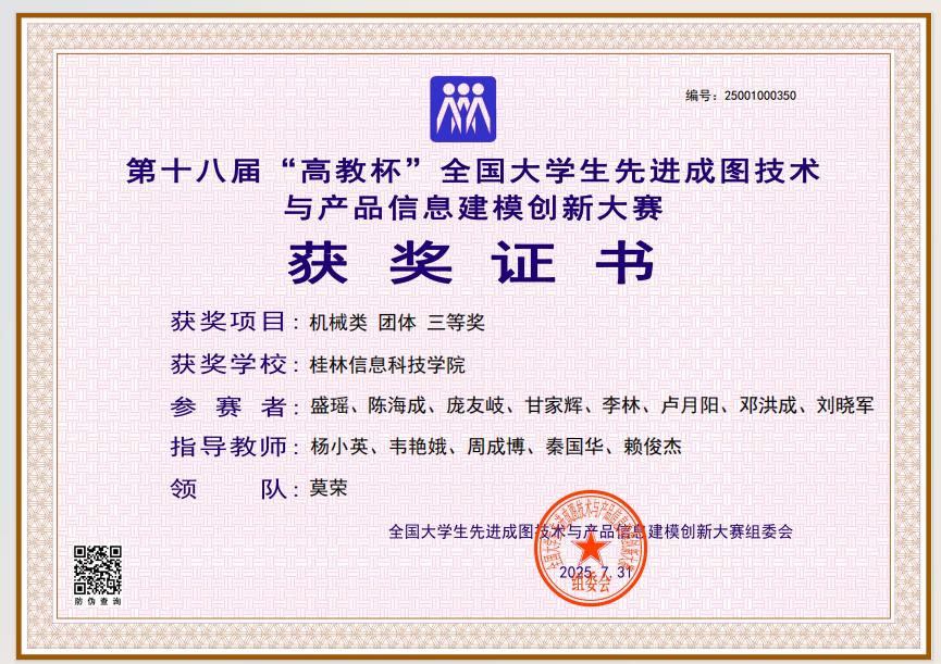 在本届大赛中,beat365官网机电工程学院牵头组织参赛工作,院长助理莫荣担任领队,机械设计制造及其自动化教研室主任、银龄教师王丽娟教授统筹规划,为选手提供全流程专业指导与资源保障。参赛团队展现出深厚的工程图学功底、精湛的建模技艺及突出的创新思维,最终荣获机械类团体全国三等奖1项,先进成图技术赛道、数字化创新设计赛道全国三等奖各1项;莫荣、王丽娟等5名指导教师因教学成效显著,获评“优秀指导老师”。