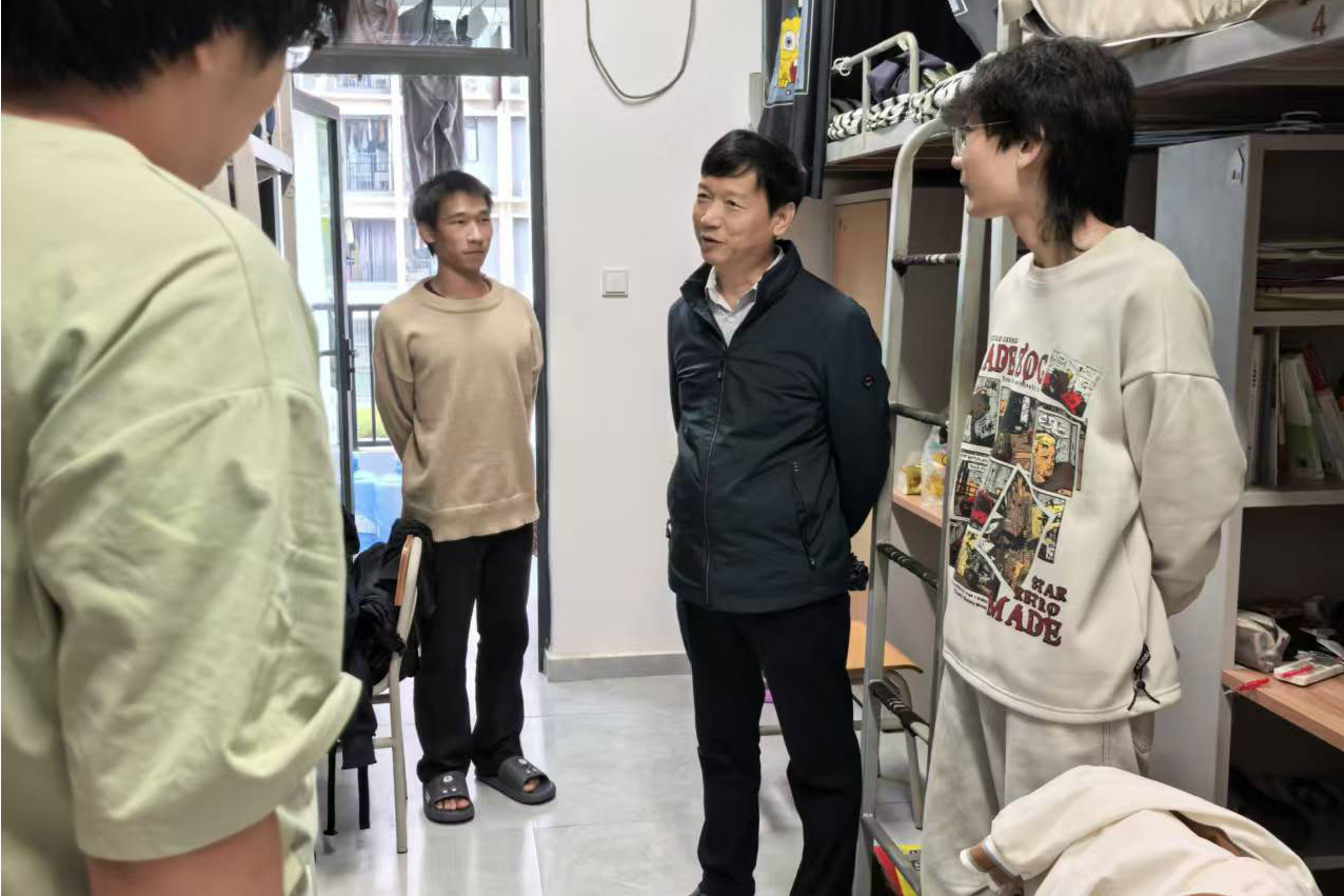 “家乡是哪里?”“对南方的气候和饮食还习惯吗?”走访过程中,解校长与同学们亲切交谈,细致询问大家入校后的生活细节,一句“生活上有没有遇到什么困难?”的贴心问候,瞬间拉近了师生间的距离,寝室里洋溢着轻松温馨的氛围。在关心学生们生活起居的同时,解校长尤为关注同学们的学业发展与长远规划。解校长结合国家发展战略与行业前沿动态,勉励新生要尽快完成从中学到大学的角色转变,科学规划大学生涯,打牢专业基础,拓宽知识视野,全面提升综合素质。他表示,大学是探索未知、塑造品格的关键时期,希望同学们志存高远,将个人理想融入国家发展的宏伟蓝图。