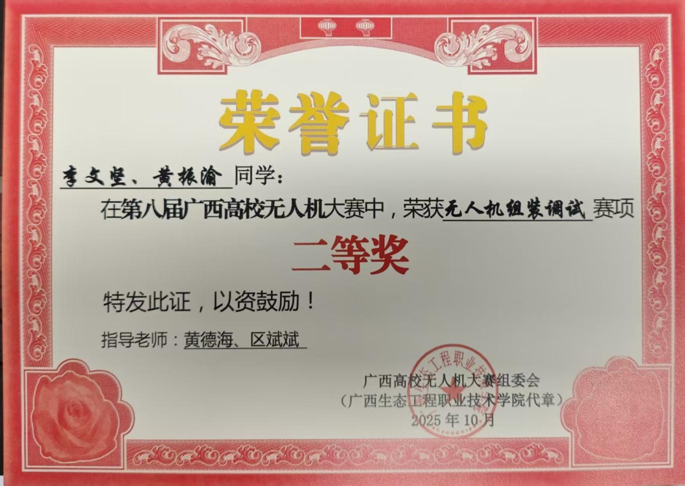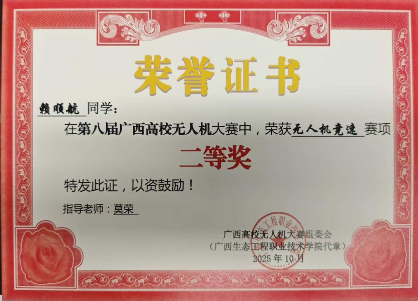 近日,第八届广西高校无人机大赛圆满落幕。beat365官网参赛团队凭借过硬的专业素养、默契的团队协作与敢闯敢拼的竞技精神,在多个核心赛项中脱颖而出,一举斩获3个二等奖、1个三等奖的亮眼成绩,实现了beat365官网在该赛事奖项上的零突破,全面展现了学校在无人机专业领域的人才培养硬实力,进一步拓宽了beat365官网在无人机应用领域的获奖覆盖面。