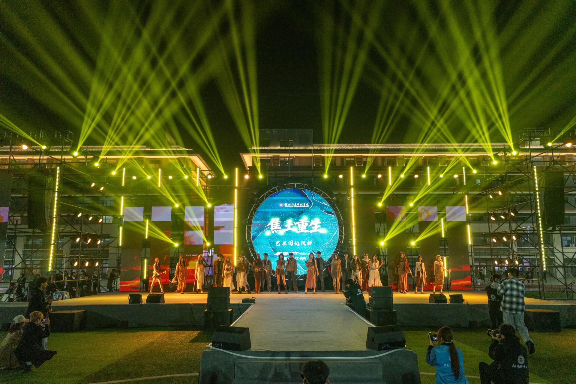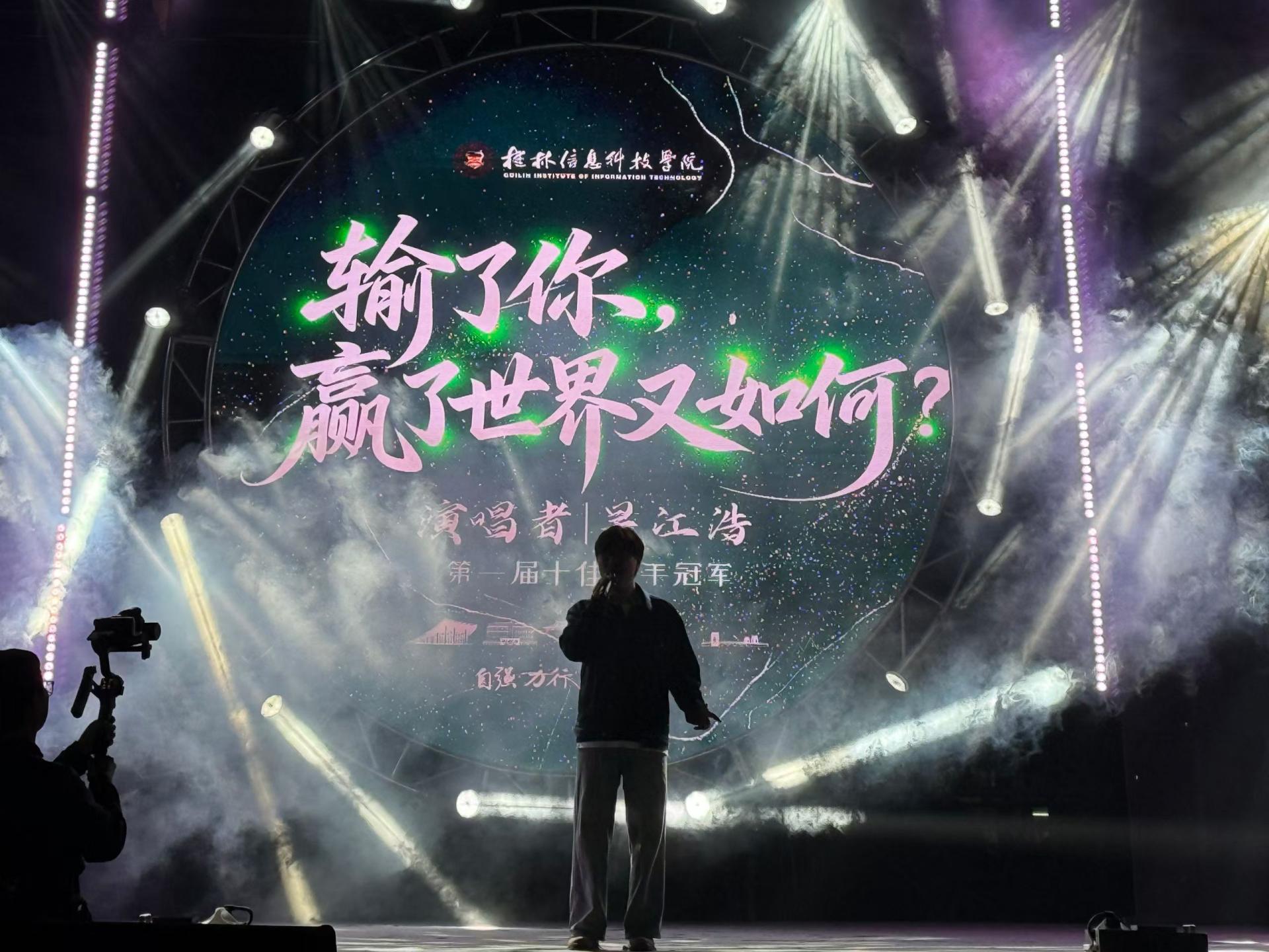 期间,学校大学生艺术团走秀《焦土重生》惊艳亮相,模特们自信的步伐与独特造型尽显时尚风采;幸运抽奖环节将气氛推向高潮,观众欢呼声此起彼伏;首届冠军吴江浩惊喜返场,一曲《输了你,赢了世界又如何》以深情演唱打动全场,让观众沉浸其中。