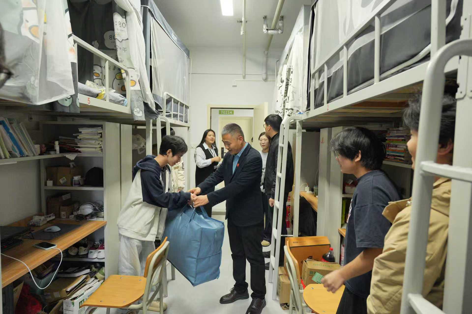 学校领导们分组前往不同社区的学生寝室,与同学们亲切交流,细致询问大家的学习和生活情况,并亲手将厚实暖和的棉被送到学生手中。“最近学习压力大不大?”“宿舍暖气够不够暖和?”“生活上还有什么困难?”一句句关切的话语,传递着学校对学子们的殷殷关怀。受助学生也纷纷表示,学校的关怀如雪中送炭,让他们倍感温暖和鼓舞,他们定会珍惜这份心意,努力学习,以优异的成绩回报学校的培养和关爱。解庆林校长在活动中强调,学生是学校一切工作的中心和重心,关心学生的健康成长是学校的首要职责,我们要深入了解学生需求,及时解决实际困难,持续做好各项服务保障工作,努力为同学们营造安全、温暖、舒适的学习生活环境,助力他们成长成才。