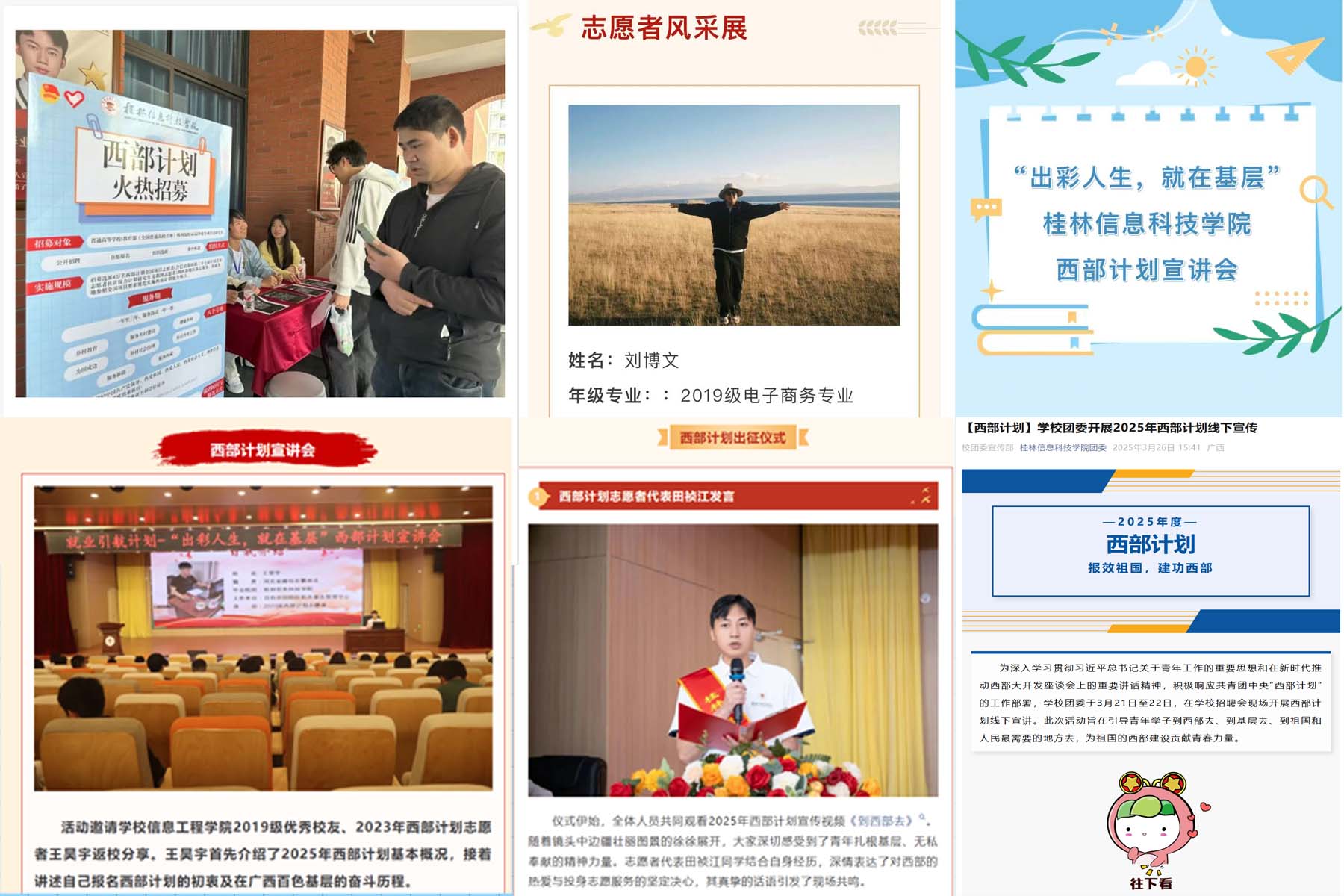 青春叙事,共鸣心灵之弦。校院两级团委借助新媒体平台优势,以专题形式持续推送西部计划内容。开设“西部计划Q&A全攻略”“学长学姐有话说”等14篇专题推送,用图文并茂的形式,生动呈现往届志愿者深入基层的真实故事。这些“青春叙事”如音符,引发同学强烈共鸣,让大家仿佛置身西部,感受风土人情与志愿者的酸甜苦辣。宣传让同学们认识到,西部计划既是锻炼机会,更是责任使命。