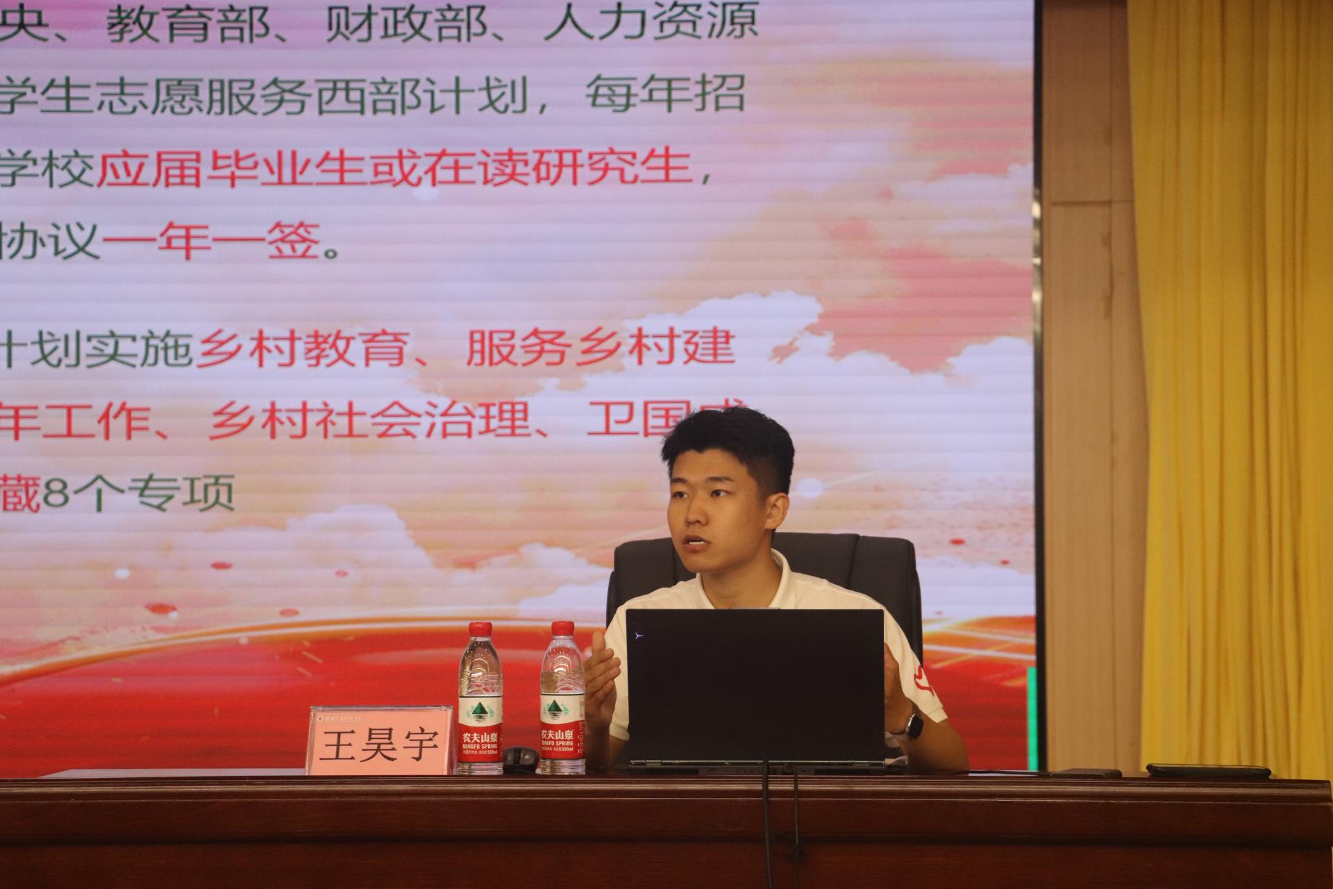 基层故事,照亮前行之路。为让同学们直观深刻认识西部计划,激发投身热情,学校举办“出彩人生,就在基层”西部计划宣讲会,特邀2023年志愿者王昊宇返校分享,他分享了他在西部基层的工作经历与成长感悟。各学院团委积极响应,广泛开展政策宣讲,有重点、分层次动员,深入班级、宿舍与学生交流,助其全面了解政策。学校和学院的努力,让越来越多同学坚定了去西部的决心。