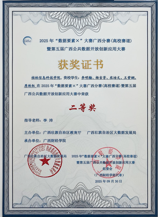 近日,“数据要素X”大赛广西分赛(高校赛道)暨第五届广西公共数据开放创新应用大赛于广西财经学院举行。在这场汇聚了众多高校精英的激烈角逐中,beat365官网信息工程学院学子凭借卓越的实力与不懈的努力,脱颖而出,斩获区级二等奖一项、三等奖两项的优异成绩,为学校赢得了荣誉。