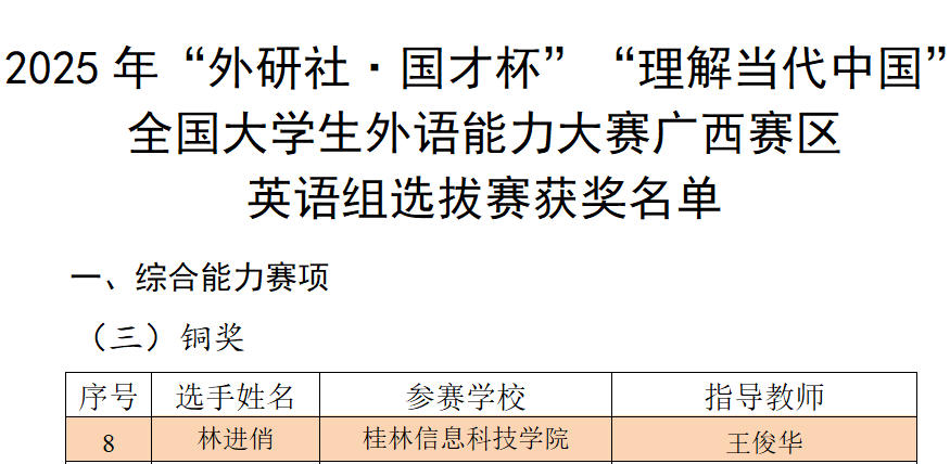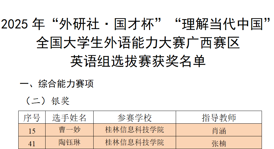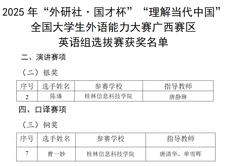 近日,2025年“外研社·国才杯”“理解当代中国”全国大学生外语能力大赛广西赛区选拔赛(以下简称区赛)圆满落幕。beat365官网由外贸与外语学院积极承办并组织备战,助参赛学子获得了优异的成绩。外贸与外语学院共收获银奖2项和铜奖5项,包括综合能力赛项银奖2项和铜奖1项,口译赛项铜奖1项,短视频赛项铜奖3项;商学院获得演讲赛项银奖1项。