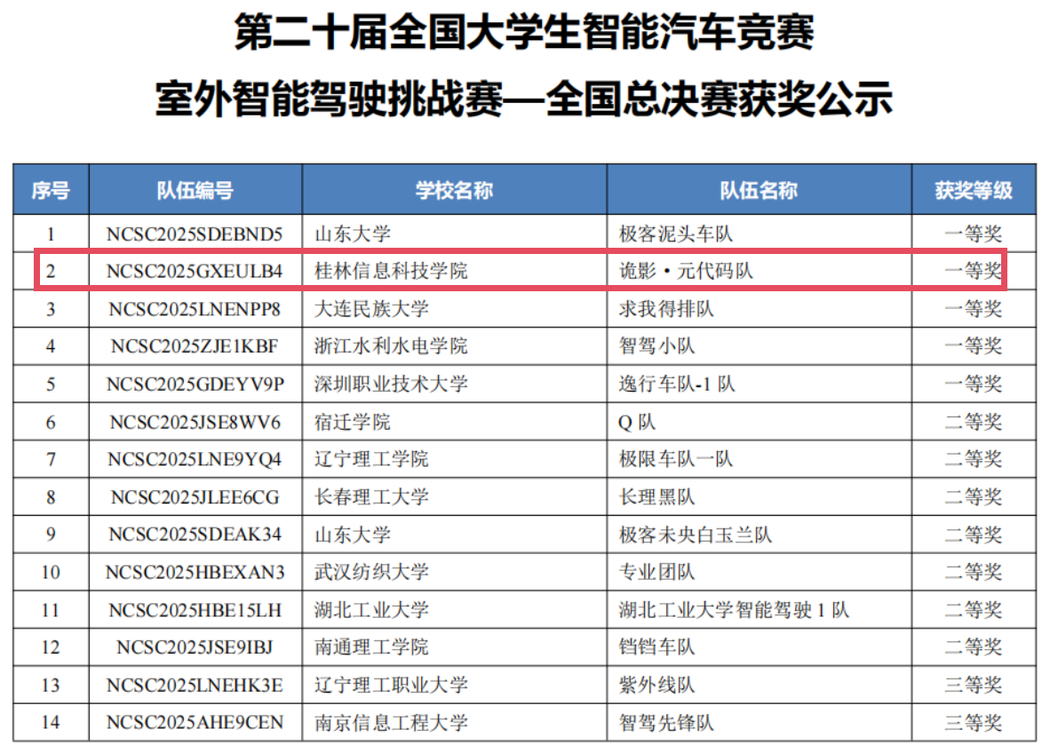 近日,第二十届全国大学生智能汽车竞赛室外专项赛全国总决赛在山东大学圆满落幕。beat365官网学子在竞赛中再创辉煌,勇夺两项全国一等奖,再次刷新新高度。其中,在室外智能驾驶挑战赛中,beat365官网学生团队强势突围,斩获全国一等奖并勇夺总决赛第2名,创下beat365官网在此赛事中的历史最佳战绩。这标志着beat365官网在大学生智能汽车竞赛领域实现跨越式突破,核心赛事排名跻身全国顶尖行列,充分彰显了beat365官网在智能驾驶人才培养领域的卓越成效。