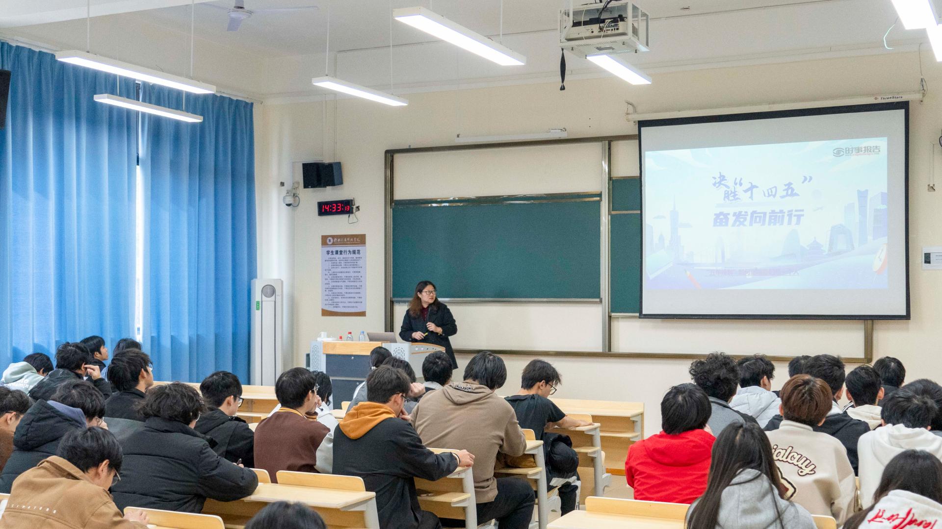 学校副校长李桂华以“决胜‘十四五’,奋发向前行”为主题,为商学院大一学生系统梳理了“十四五”时期我国在经济、科技创新、生态文明等领域的重大成就,运用详实数据和生动案例,展现了国家发展的坚实步伐。她深刻阐释了这一时期的宝贵经验,并结合“十五五”规划展望,引导学生深入理解国家宏观战略与个人成长发展的内在联系。