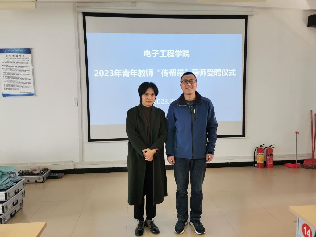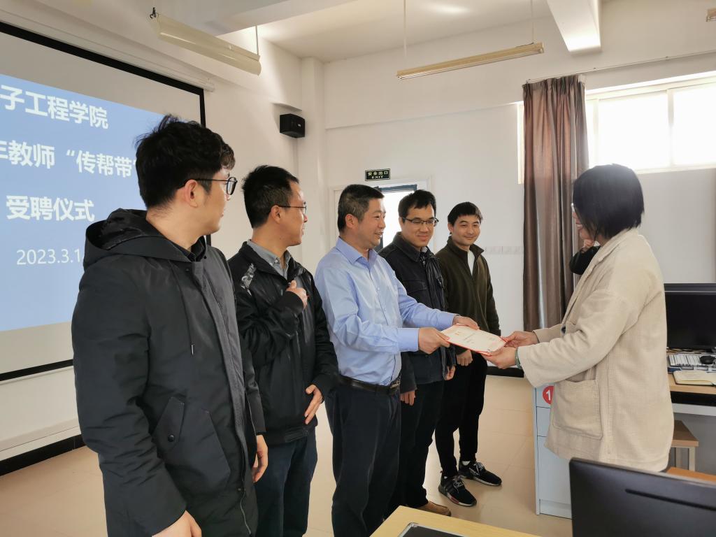 3月15日,电子工程学院在41404实验室举行2023年青年教师“传帮带”导师受聘仪式。学院院长韩桂明、党总支书记庄璧瑛、副院长易艺、受聘导师及青年教师参加会议。