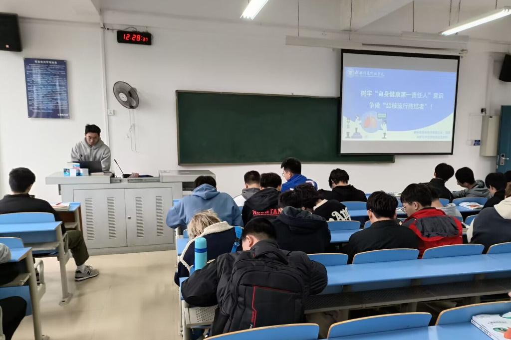 会上,辅导员对结核病进行了概述,随后分别从结核病的基本知识、传染性、疾病症状、预防措施、结核病案例五个要点进行详细介绍。同时,通过日常宿舍检查时发现的个人卫生与宿舍卫生问题进行图片、视频展示等方式,学生认识到环境卫生的重要性,并呼吁学生要注意日常生活卫生、宿舍保持通风状态。