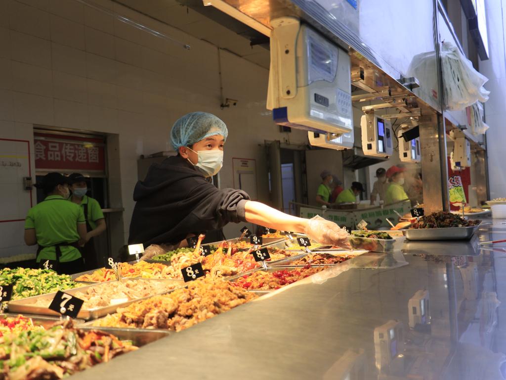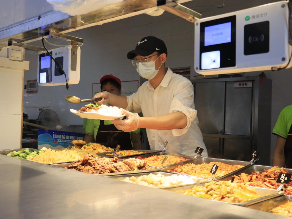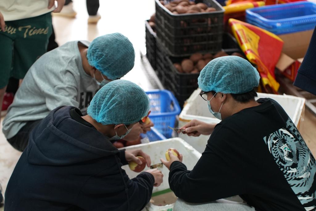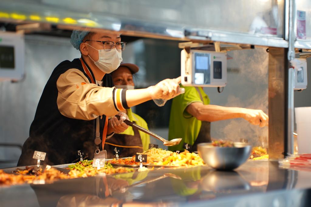 活动内容分为参观后厨和亲自体验两个部分。秦经理带领师生代表们依次参观了食材库、洗菜间、切配间、加工间、洗消间等各功能区域,并为大家详细介绍了学校食堂原材料采购、食品贮存、生产加工、食品留样、清洗消毒、员工管理等情况。参观期间,师生们积极参与,亲自体验了菜品粗加工和食品热加工工作,并在售卖间化身“打饭侠”,体验打饭、售卖,烫粉、出餐等工作流程。