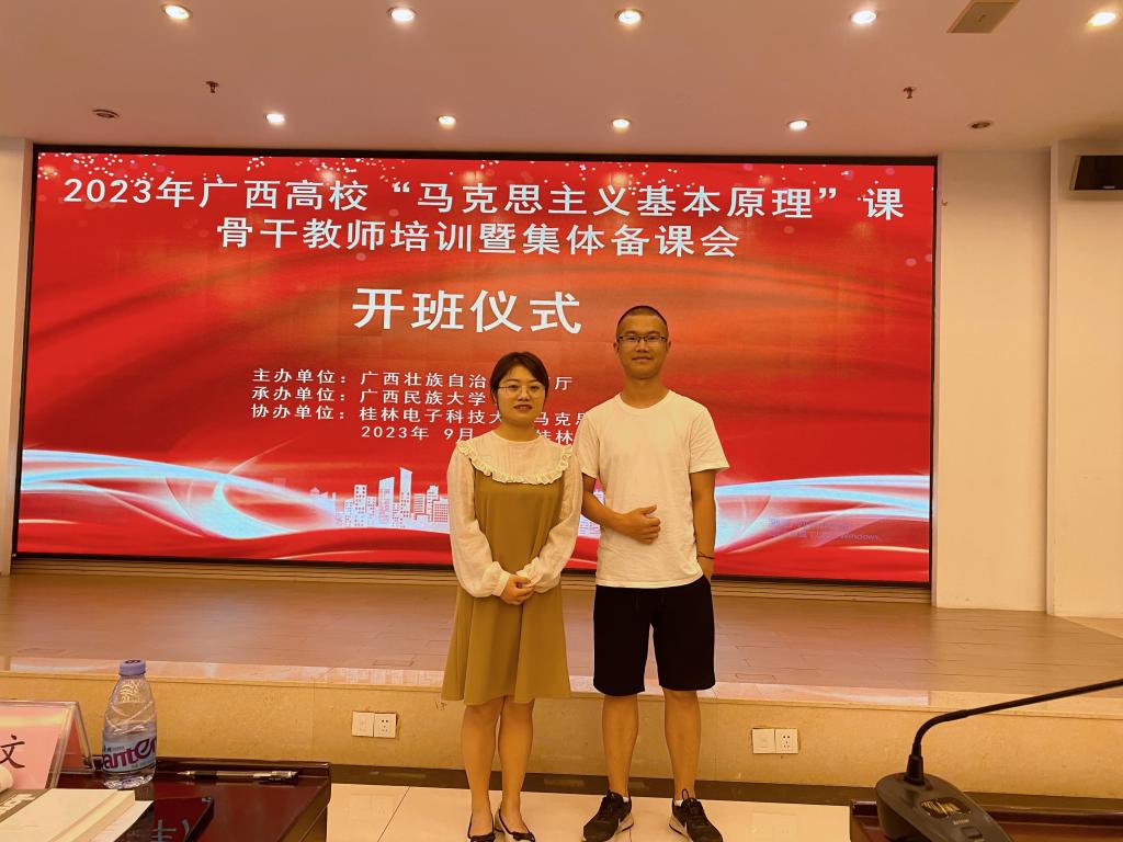 为进一步加强广西高校思想政治理论课建设,不断提高思政课教师理论水平,近日,由自治区教育厅主办、广西民族大学承办的2023年全区高校“马克思主义基本原理”课骨干教师培训暨集体备课会在桂林举行。来自全区40多所高校的100余名思政课骨干教师参加了此次培训会,我院教师姜凡、石珂参加培训。