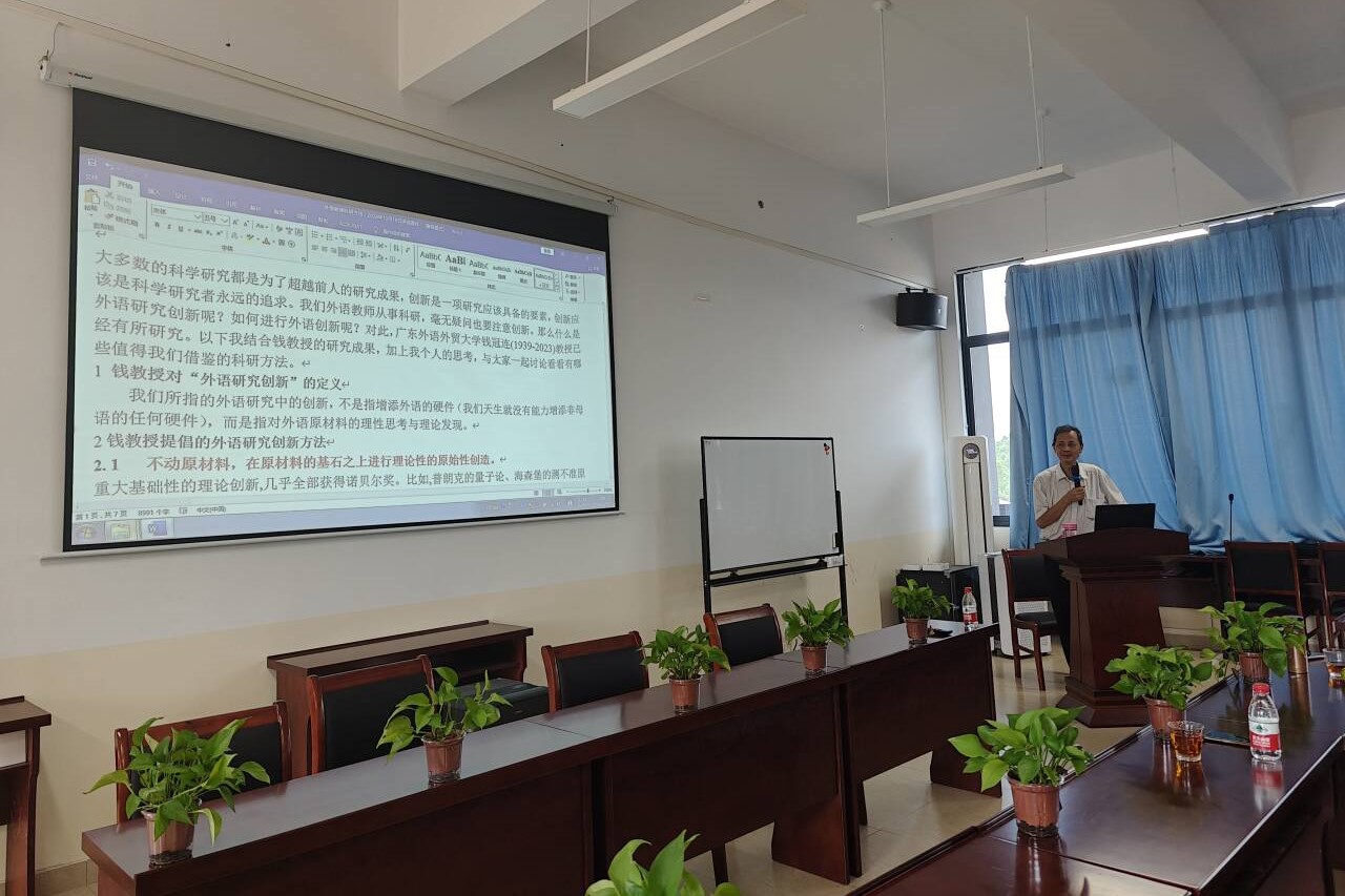 近日,外贸与外语学院邀请了银龄教师袁斌业教授,为学院教师以《外语教师科研方法谈》为题作专题学术讲座。此次讲座由学院院长王家年教授主持,全体教师到场聆听。