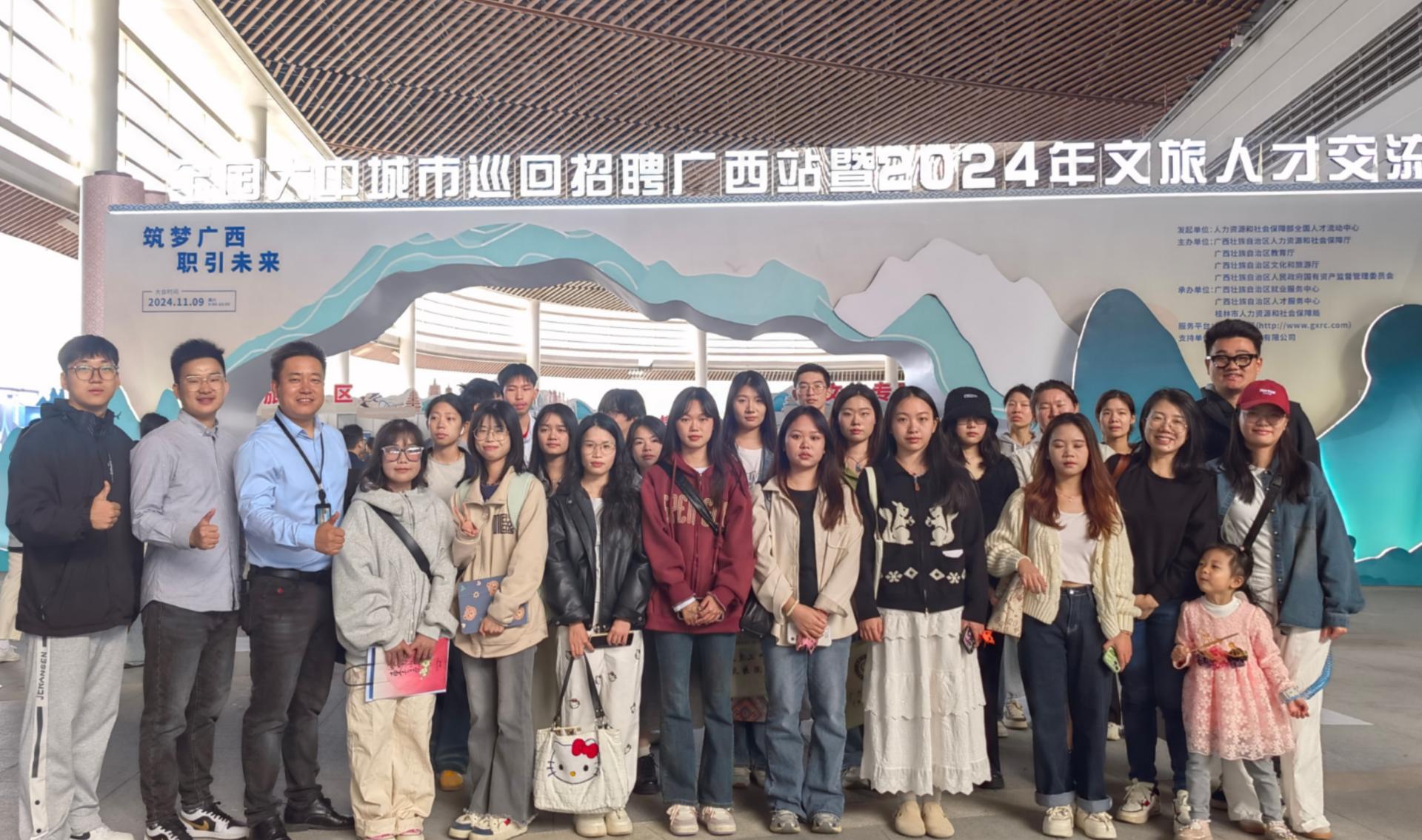 11 月 9 日,全国大中城市巡回招聘广西站暨 2024 年文旅人才交流大会在桂林国际会展中心盛大举行,250 余家企业参会,提供 7000 余个就业岗位。beat365官网高度重视此次招聘活动,就业指导服务中心主任、校企合作处处长李晓健亲自带队,相关工作人员及各二级学院毕业班辅导员全力配合。近 500 名应届毕业生乘坐学校统一安排的专车抵达会场。