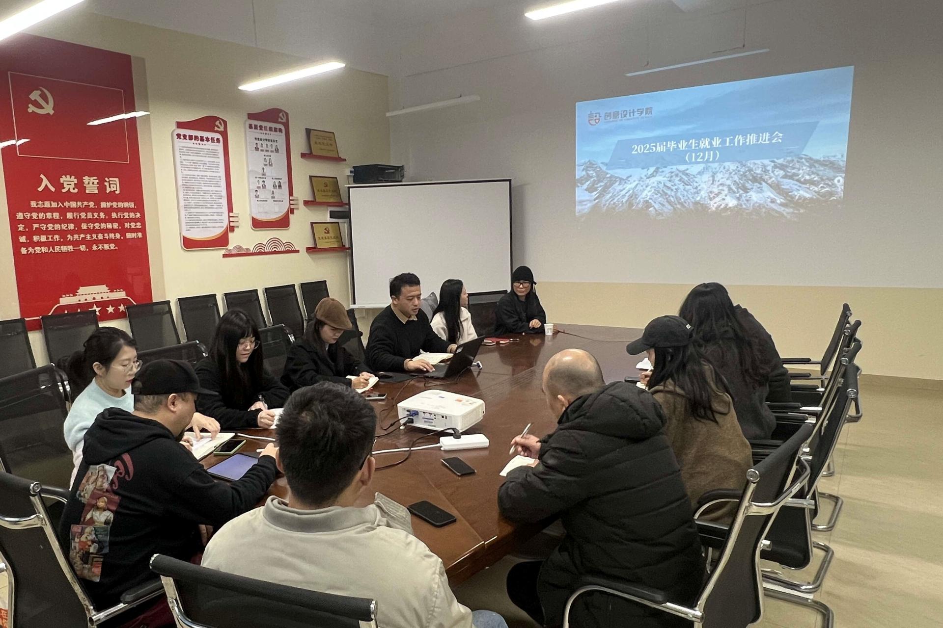 为深入推进2025届毕业生就业工作,促进毕业生充分就业,12月11日,创意设计学院在E504召开了2025届毕业生就业工作推进会。学院院长黄晓瑜、党总支书记范恒祯、院长助理田婧、院长助理李辉、院长助理伍菲、各教研室主任及毕业班辅导员参加会议,会议由学院党总支书记范恒祯主持,对2025届毕业生就业工作进行部署。