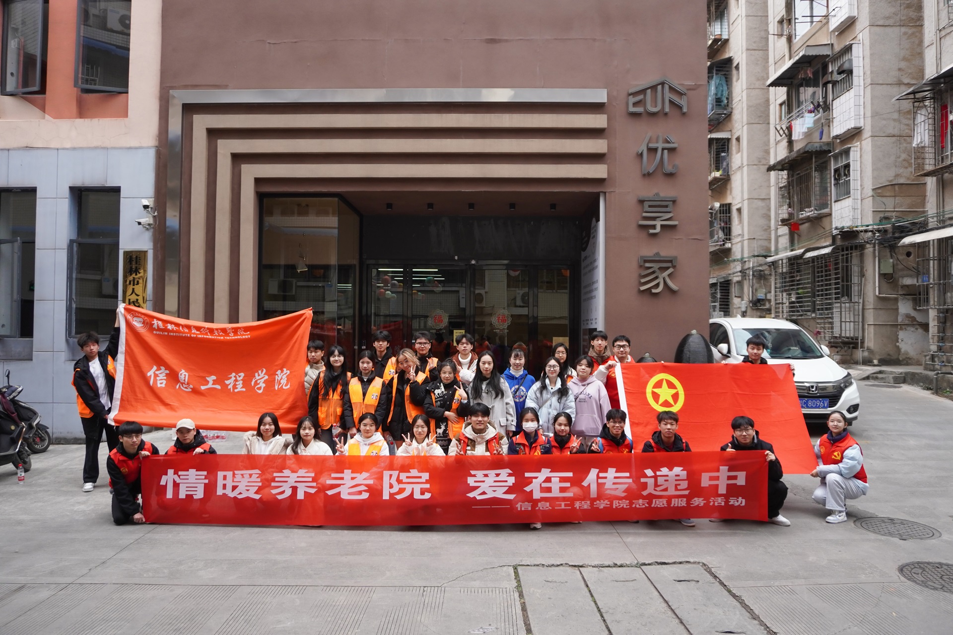 12月17日,信息工程学院在桂林优享家养老服务中心成功举办了一场以“情暖夕阳,爱满养老院”为主题的志愿服务活动。本次活动由信息工程学院学工办主任廖星男、信息工程学院团委副书记薛航,以及我院各年级辅导员代表和“信息青年”志愿者们共同参与。