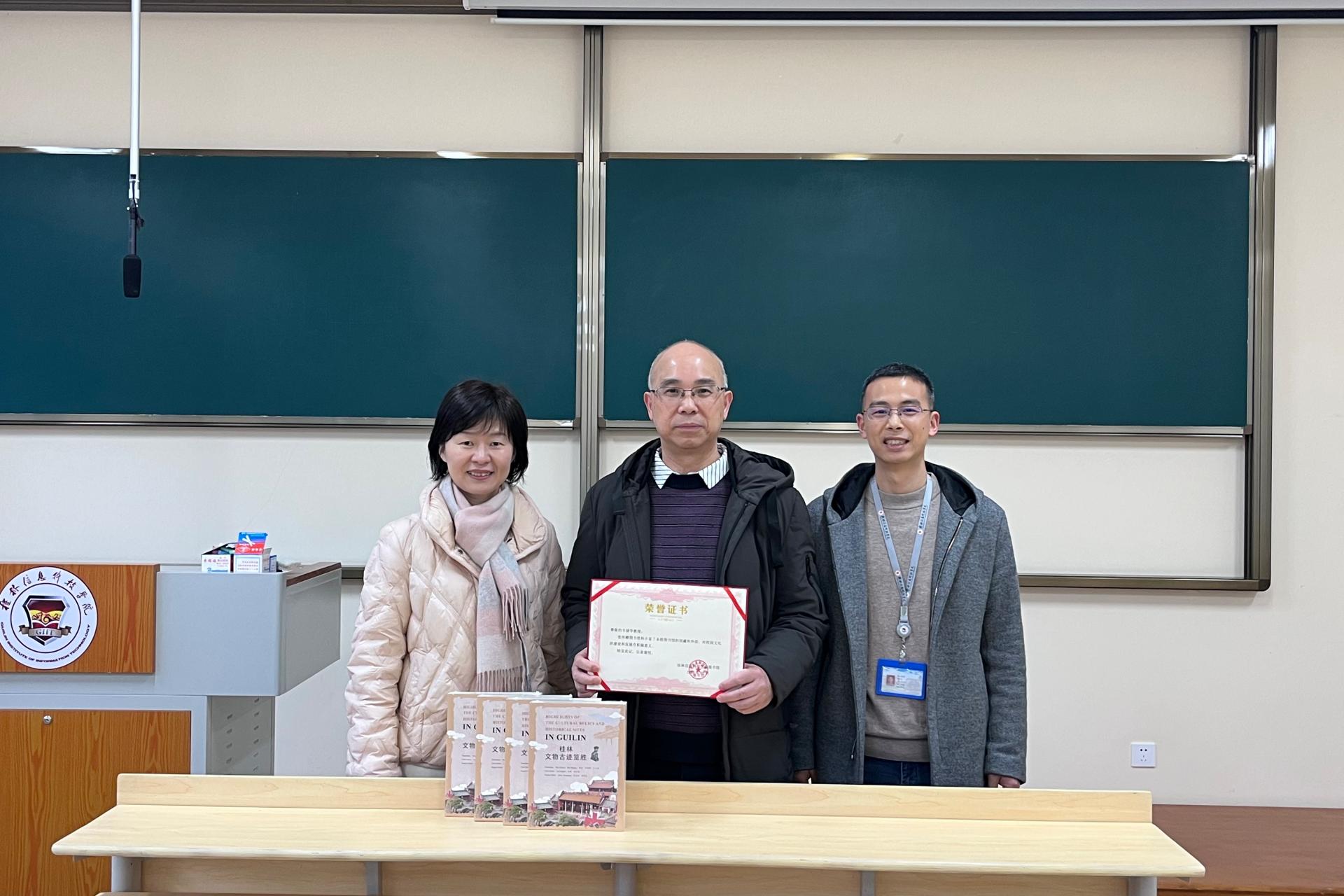 韦储学教授(中)向图书馆捐赠图书