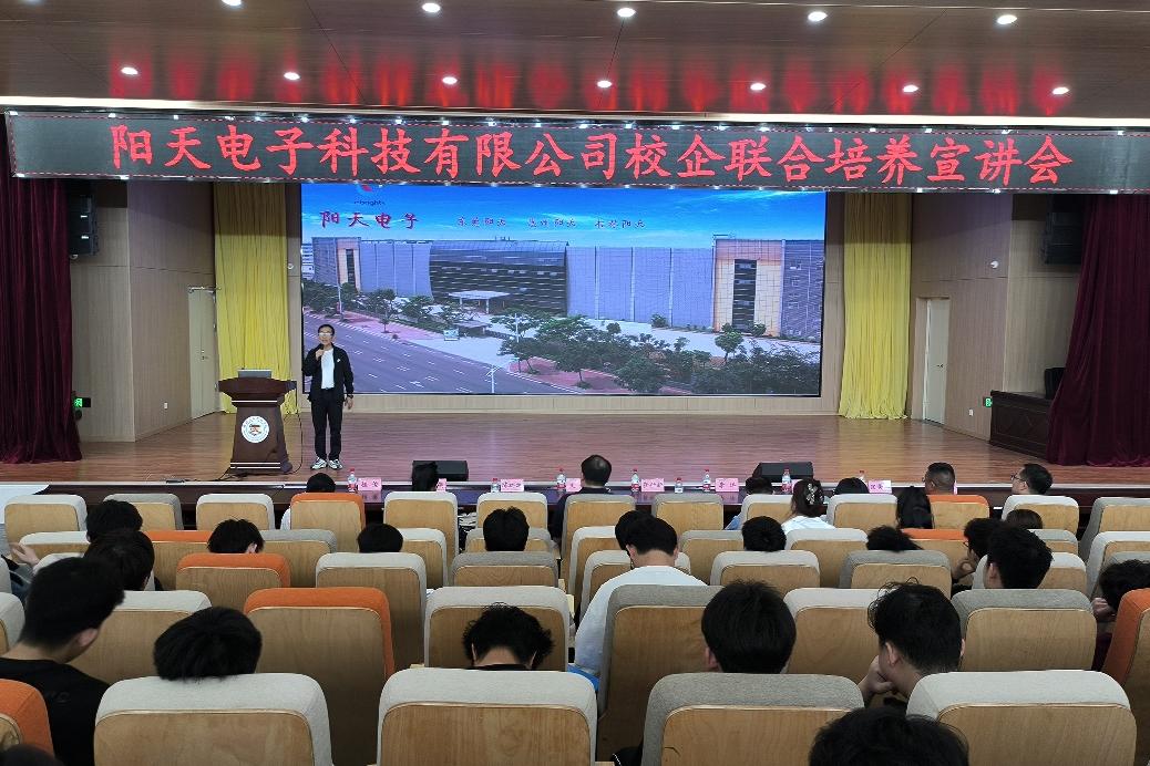 为深化产教融合,拓宽学生就业渠道,3月27日,机电工程学院与中航(东莞)阳天电子科技有限公司联合举办校企联合培养暨毕业生招聘宣讲会。学院党委书记文超、企业总经理助理崔世新出席活动,吸引机电工程学院2021级、2022级学生及辅导员等400余人参与。