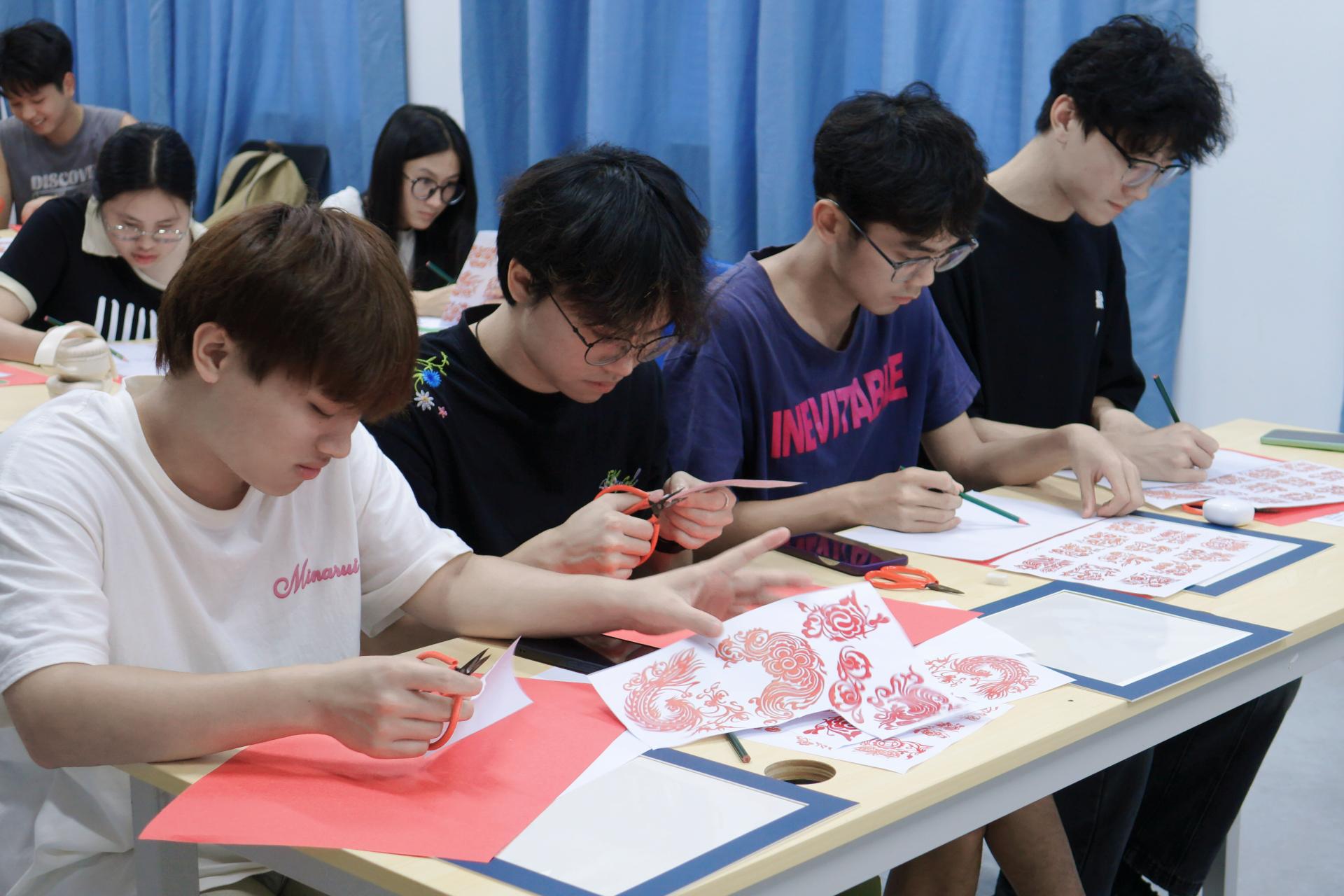 学生在进行剪纸
