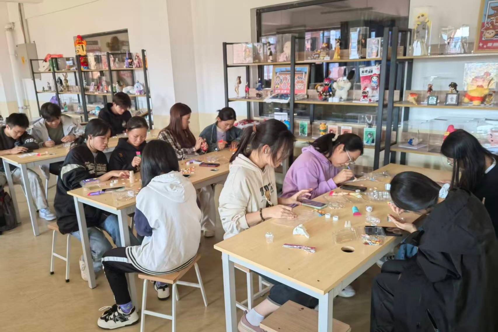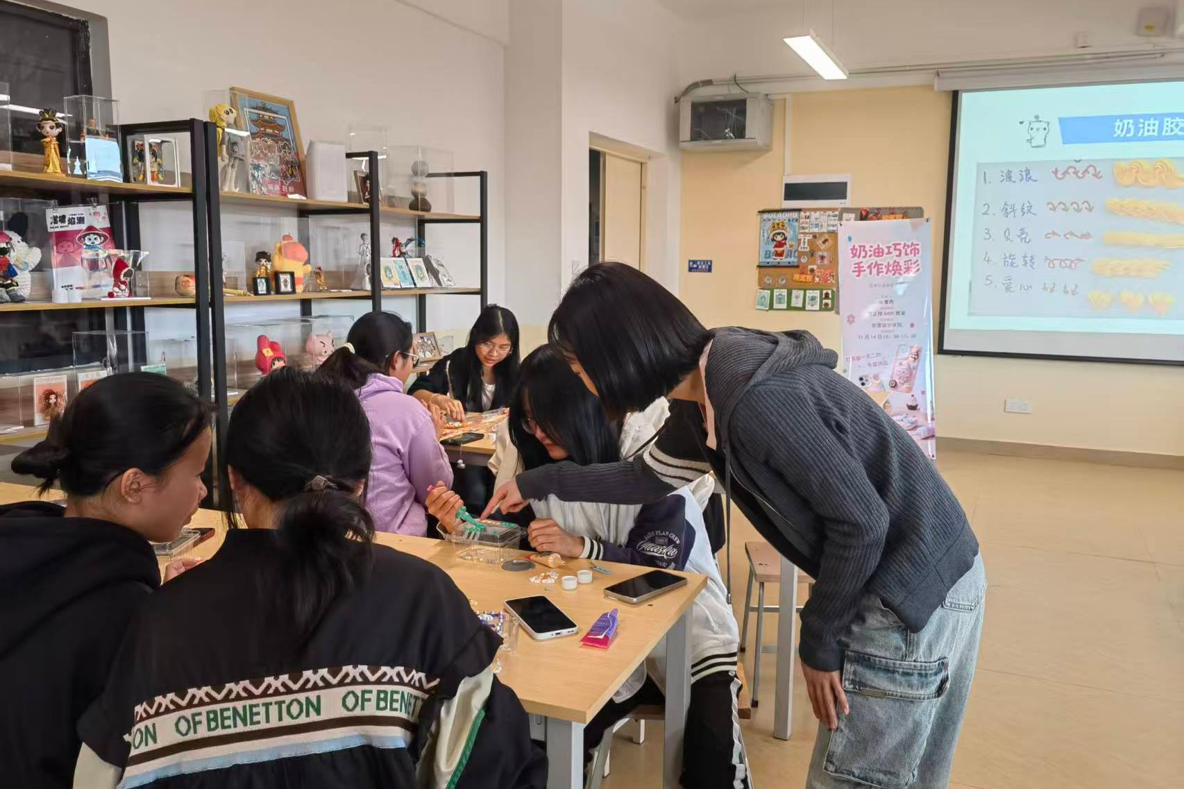 活动现场的布置温馨且雅致,桌面上整齐陈列着各类奶油胶、卡通公仔、亮片、珍珠、树脂配件等材料,以及手机壳、小镜子等制作载体,浓厚的创作氛围油然而生。活动伊始,张菁芮老师向同学们展示了多款奶油胶手工成品,包括色彩明快的手机壳、精致可爱的化妆镜、实用美观的收纳盒等,这瞬间激发了大家的创作热情。随后,张老师结合实物进行演示,详细阐释了奶油胶的特性以及使用工具的操作方法,着重示范了挤花技巧,从基础的圆形、星形挤法到进阶的渐变花纹制作,同时分享了装饰物搭配的色彩协调原则与层次感营造技巧,并耐心解答了同学们提出的疑问,为后续创作奠定了坚实基础。在自主创作环节,同学们围坐在一起,构思设计方案,创作风格各异的作品,现场洋溢着欢声笑语。
