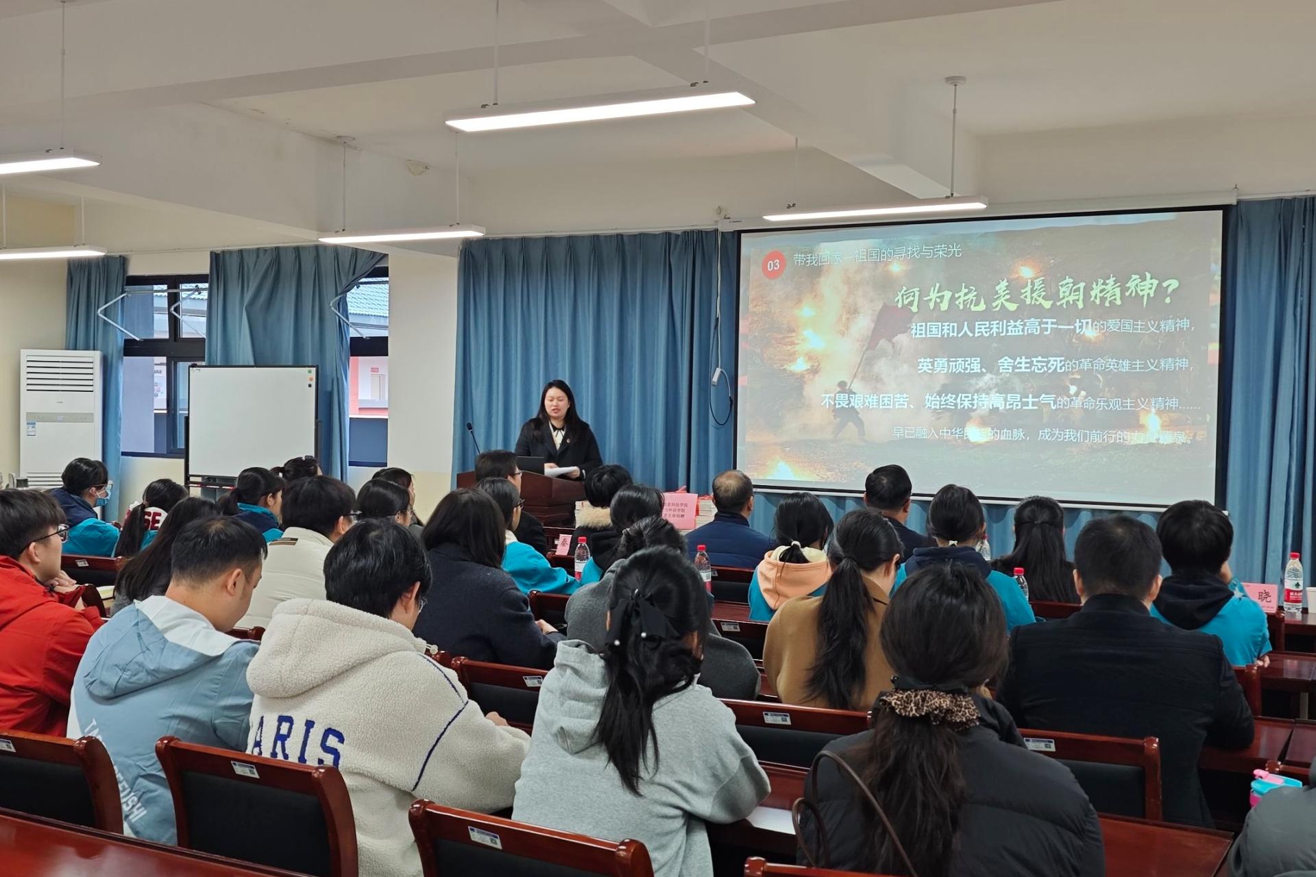 本次宣讲由陈韵姿老师主讲,主题是“学习抗美援朝精神”,围绕“待我回家——战士的承诺与期盼”“代我回家——英雄的牺牲与传承”“带我回家——祖国的寻找与荣光”“吾辈担当——我们的责任与行动”四个方面展开,为在场师生展开了一场跨越时空的精神对话。宣讲伊始,陈韵姿老师带领大家回溯峥嵘岁月。在新中国成立初期,我国面临国外武装势力的严峻威胁,百万志愿军将士告别亲人,带着“待我回家”的朴素约定,义无反顾踏上征程,用青春与热血践行对祖国和人民的誓言。随后,一个个感人至深的英雄故事让现场师生深受震撼。当宣讲进入“带我回家”篇章,在场师生无不动容。抗美援朝精神的核心是爱国主义、革命英雄主义、革命乐观主义精神,早已融入中华民族血脉。这场胜利更打出了国威军威,捍卫了国家安全,振奋了民族精神,推动了世界和平。在“吾辈担当”环节,陈韵姿老师结合高铁飞驰、航母巡洋、神舟问天、北斗组网等新时代成就,直观展现先烈用生命换来的和平繁荣。她号召师生既要“看见”历史的厚重,“铭记”英雄事迹,让英雄故事成为精神坐标。