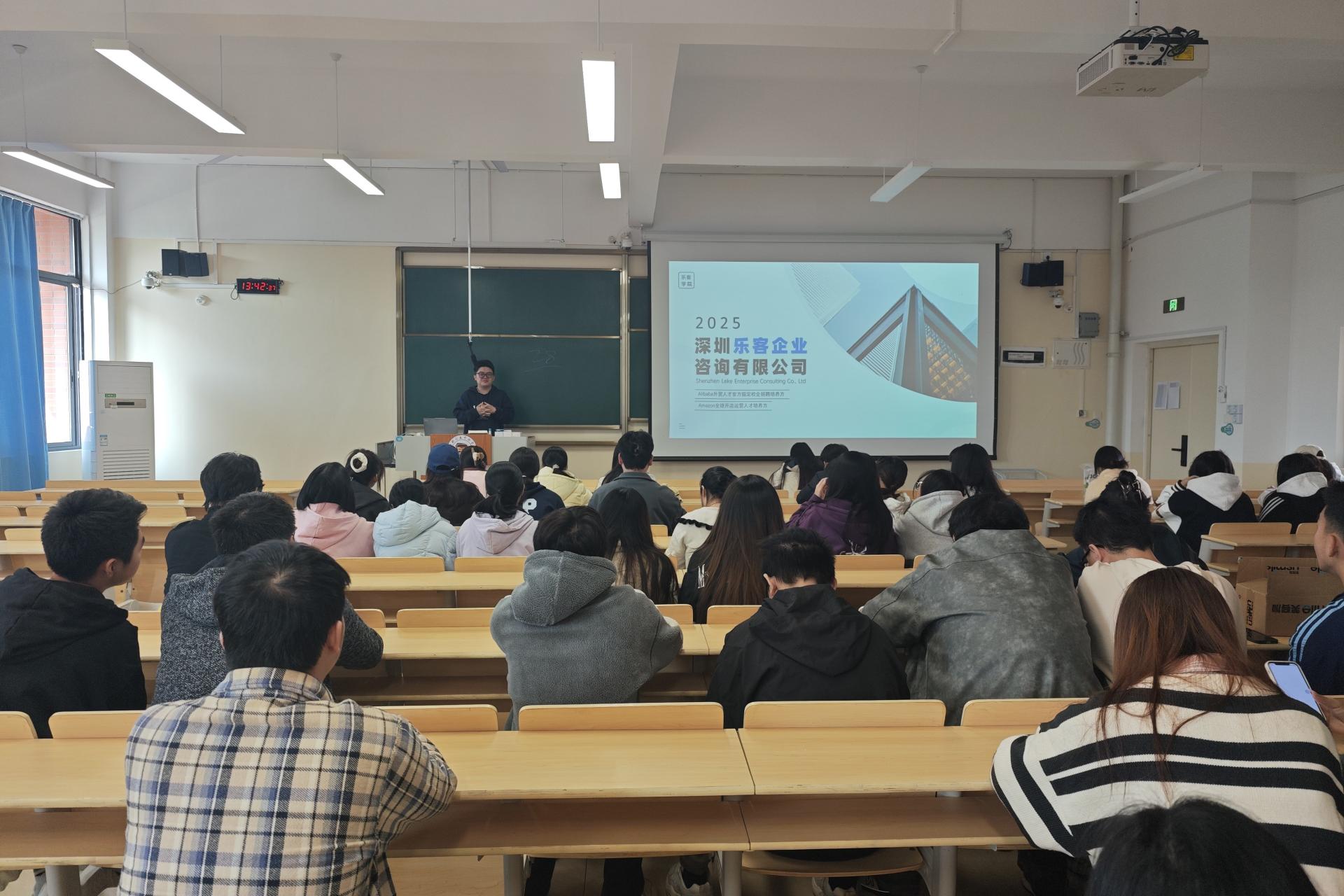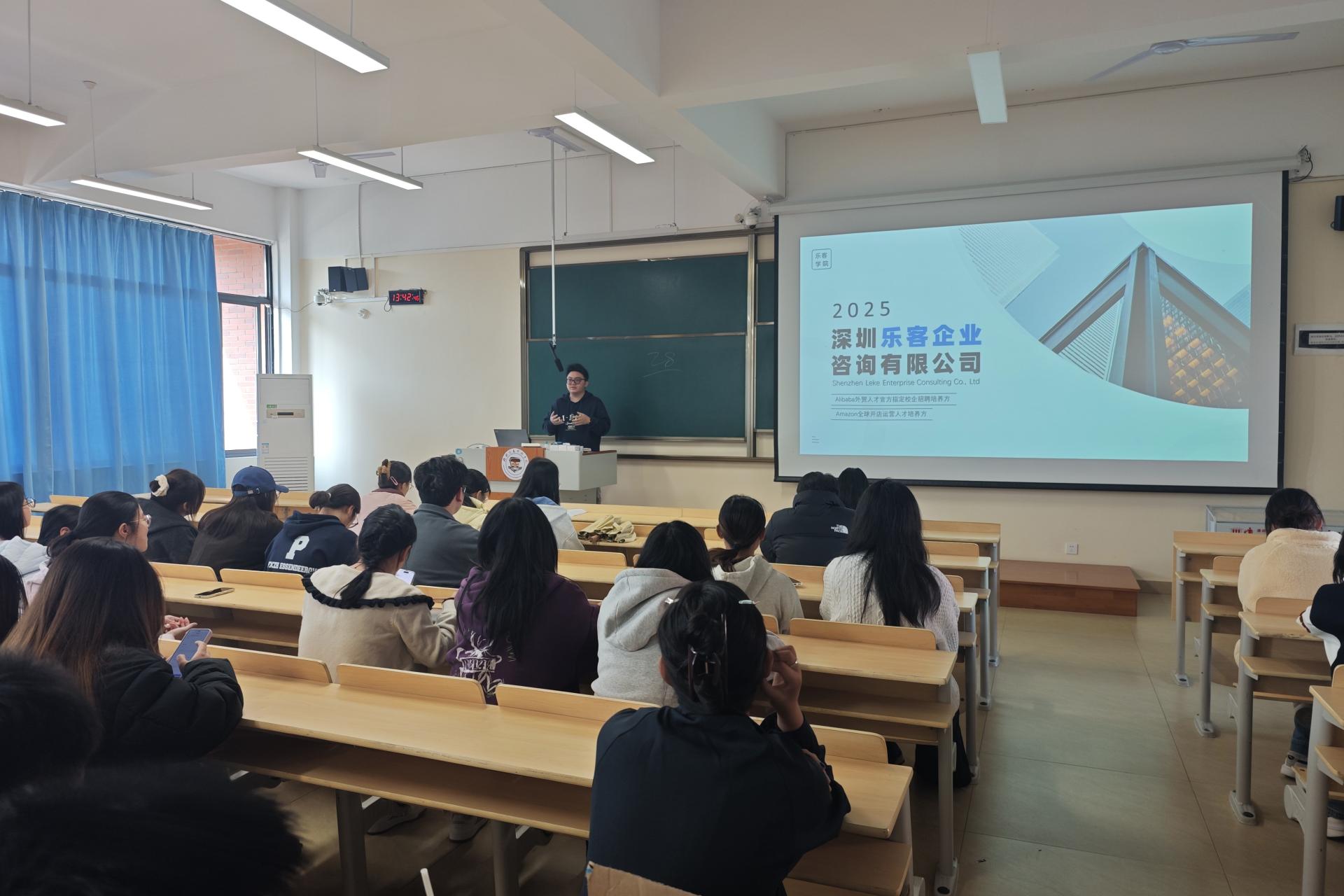 12月8日,外贸与外语学院在学校D208开展深圳乐客企业咨询有限公司专场招聘宣讲会。本次会议邀请学院2024届优秀校友黄佳乐作为企业招聘代表进行宣讲,学院党委副书记杨锦超、毕业班辅导员王莹及全体在校未就业毕业生参加。