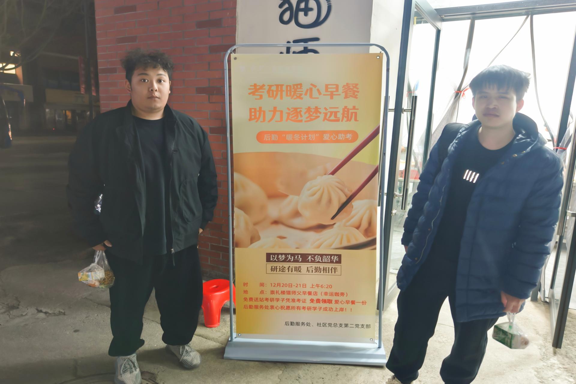 研考启幕,温情相伴。为助力考研学子以饱满状态迎接考试,在全国硕士研究生招生考试12月19日-20日清晨,后勤服务处精心策划开展“爱心早餐助研考”活动,为奔赴考场的百余名学子免费赠送暖心早餐,用实际行动传递关怀,践行“以学生为中心”的服务理念。