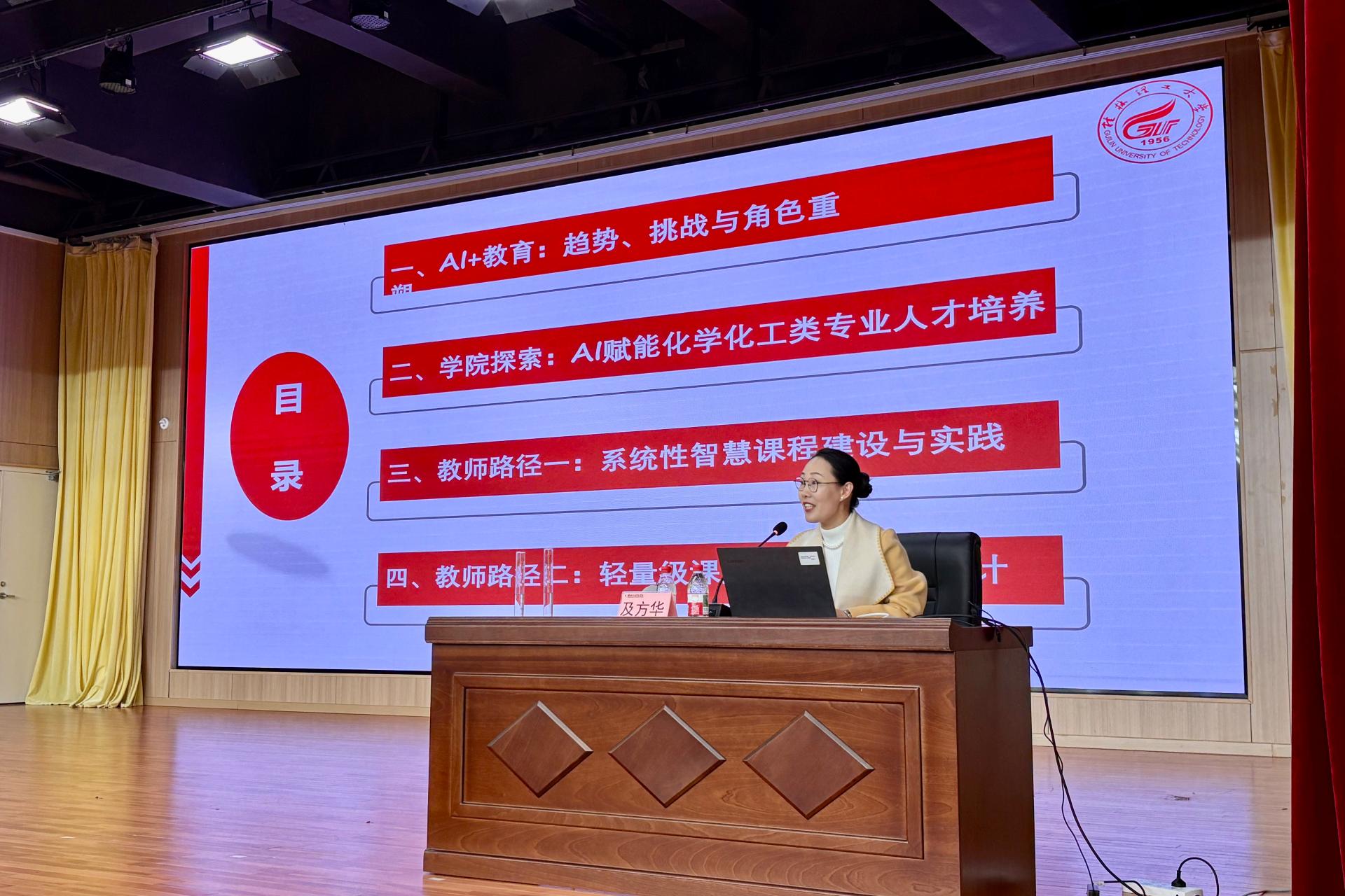 及方华副教授以“AI赋能教学:从理念到课堂”为主题,系统梳理了AI教育的发展趋势与角色重塑,并结合化学化工类专业人才培养实践,详细介绍了“系统性智慧课程建设”与“轻量级课堂智能体融合”双路径实施策略。她通过“偏摩尔性质”教学案例,生动展示了如何借助智能体实现问题导入、探究学习与价值引领的深度融合。