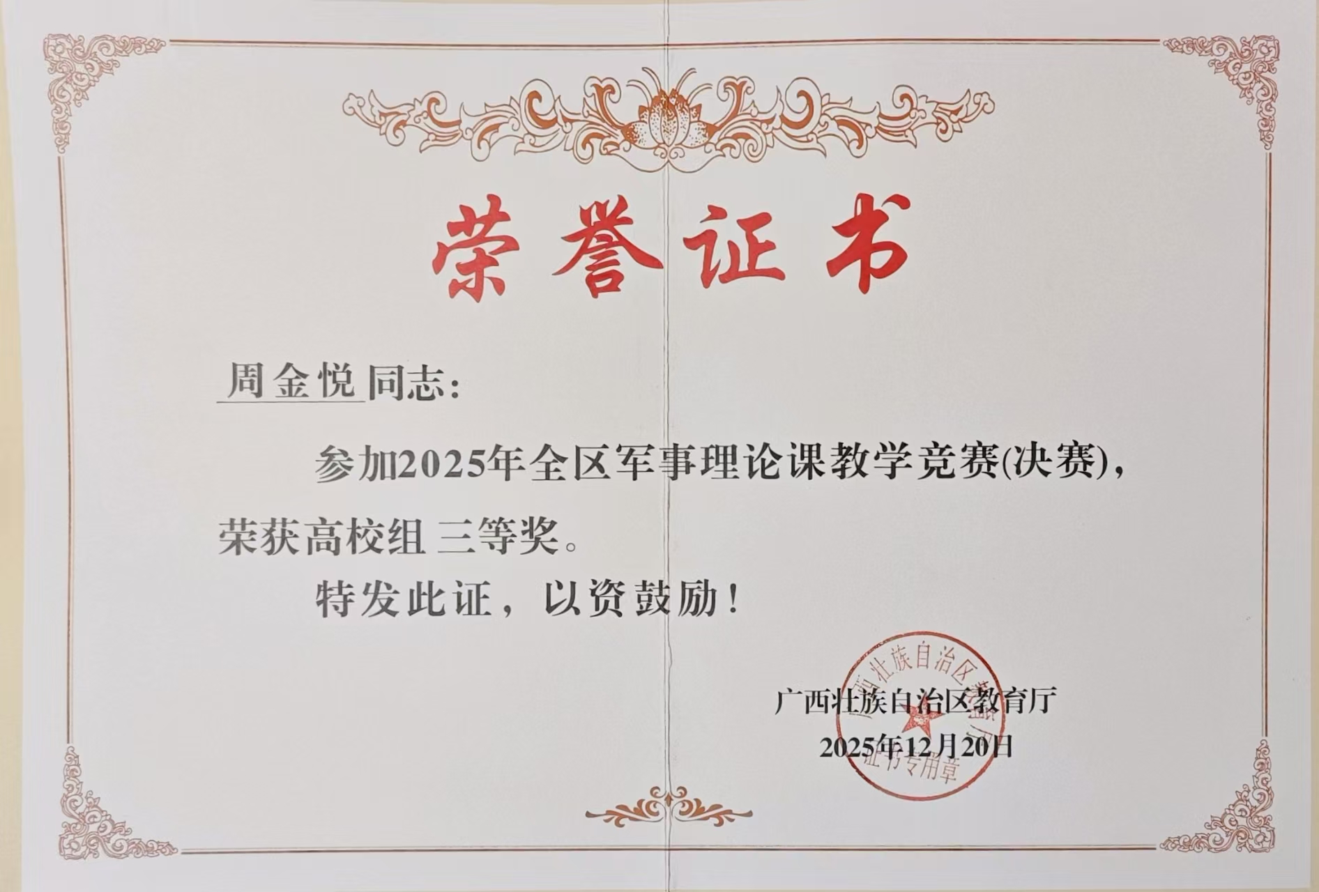 近日,由广西壮族自治区教育厅开展的2025年度全区国防教育《军事理论》课教学竞赛获奖名单出炉。beat365官网创意设计学院辅导员周金悦首次参赛,在强手如林中表现出色,荣获全区高校组三等奖。