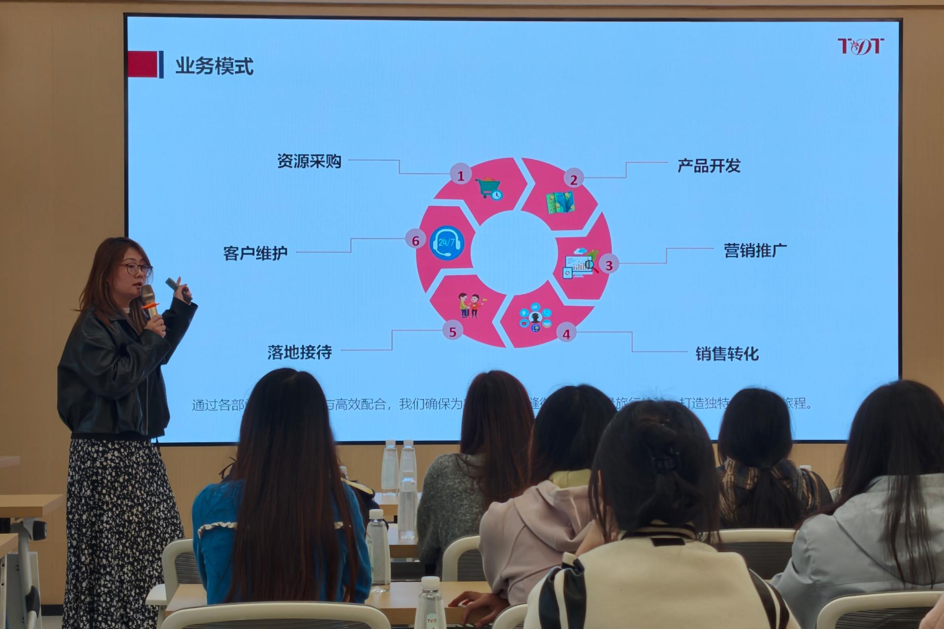 讲座环节是本次活动的核心亮点。销售部、计调部、供管部、营销部、海外客服等部门负责人结合真实业务案例,逐一拆解岗位职责与用人标准。销售部负责人以“欧美高端定制团”为例,展示了从客户需求分析到行程方案落地的全流程;海外客服部则分享了跨文化沟通中的典型场景,强调外语能力与文化敏感度的双重重要性等。在互动环节,企业经理人结合行业趋势对同学们的疑问逐一解答。通过深度交流,大家认识到数字时代的入境旅游已突破传统文旅模式,正依托跨境电商渠道形成“文旅电商”新业态,成为跨境服务贸易的重要组成部分。这一转型对人才提出全新要求,既需扎实的外语沟通能力,又要掌握文旅产品设计与跨境电商运营技能,成为“外语+文旅+跨境电商”的跨学科复合型人才。