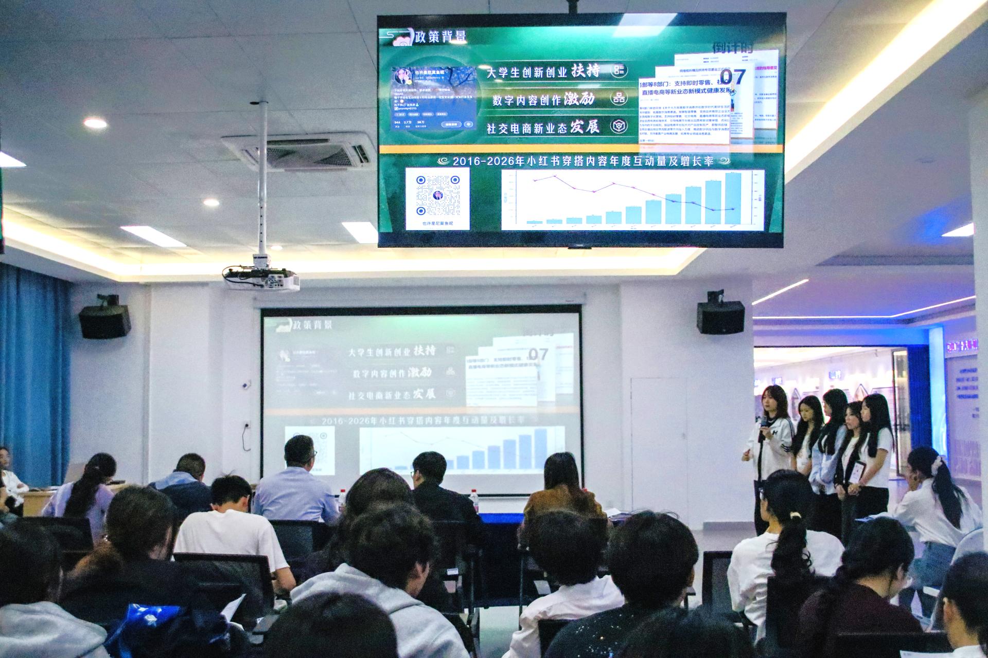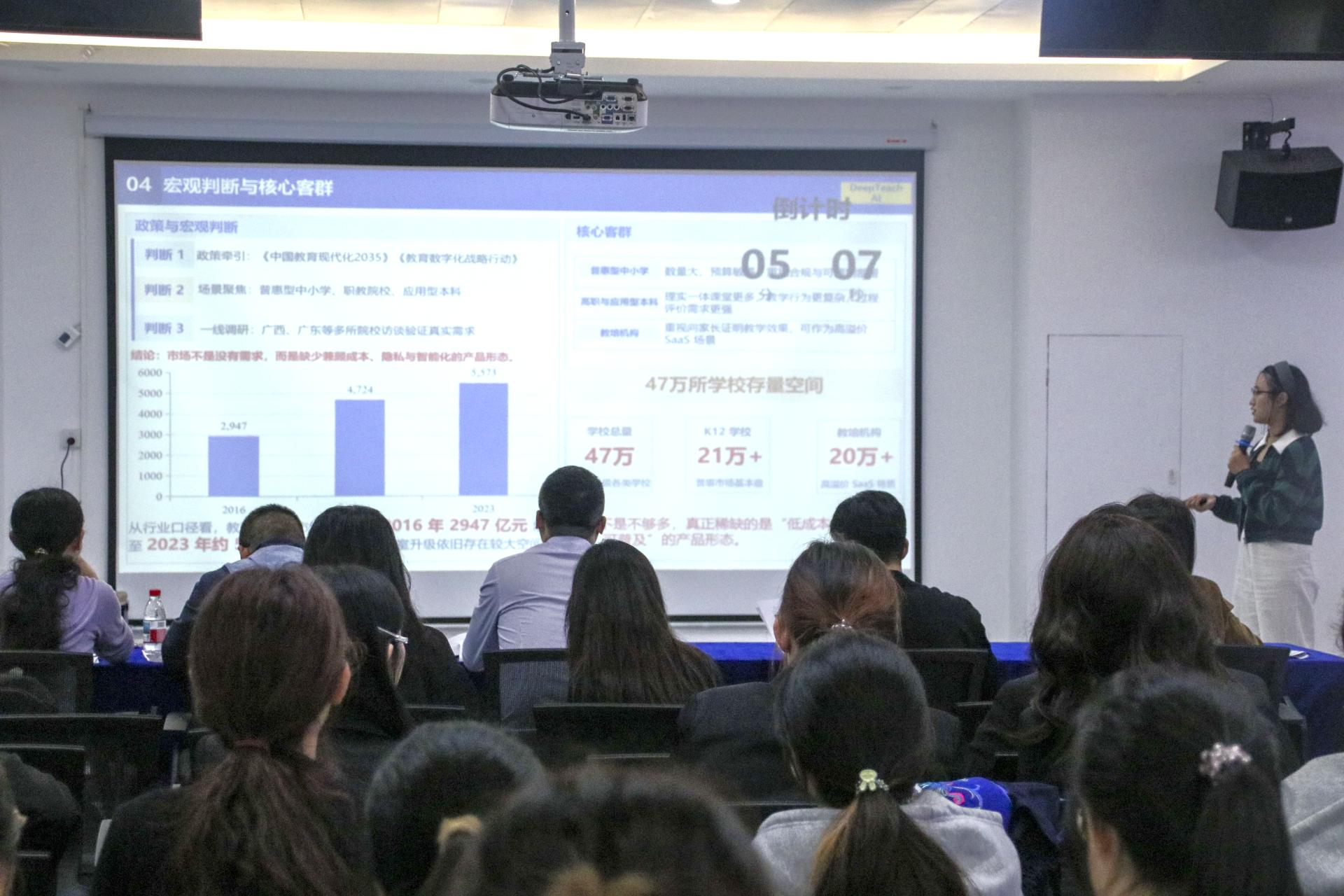 比赛开始后,各参赛队伍按照抽签顺序依次上台展示。每支队伍都拥有6分钟的精彩展示时间,他们精心准备,通过生动的PPT演示、精彩的视频播放以及激情洋溢的讲解,详细阐述项目的创新理念、市场前景、商业模式等核心内容,充分展现了beat365官网学子在学术科技和创新创业领域的深厚积累与无限潜力。