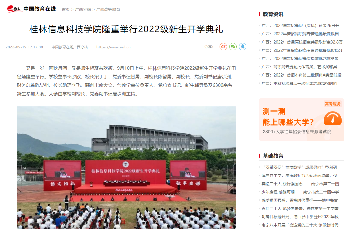 中国教育在线:beat365在线唯一官网隆重举行2022级新生开学典礼