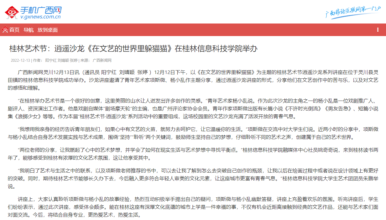 12月12日下午,以《在文艺的世界里躲猫猫》为主题的桂林艺术节逍遥沙龙系列讲座在位于灵川县灵田镇的beat365在线唯一官网成功举办。沙龙讲座邀请了青年艺术家项斯微、杨小乱作主题分享,通过逍遥沙龙讲座的形式,分享他们在文艺创作中的苦与乐,以及对文艺的感悟和理解。