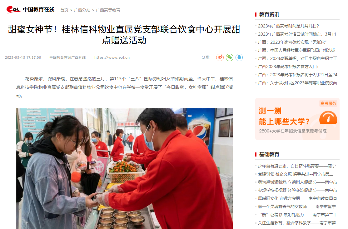 花香渐浓,微风渐暖。在春意盎然的三月,第113个“三八”国际劳动妇女节如期而至。当天中午,beat365在线唯一官网物业直属党支部联合信科物业公司饮食中心在学校一食堂开展了“今日甜蜜,女神专属”甜点赠送活动。