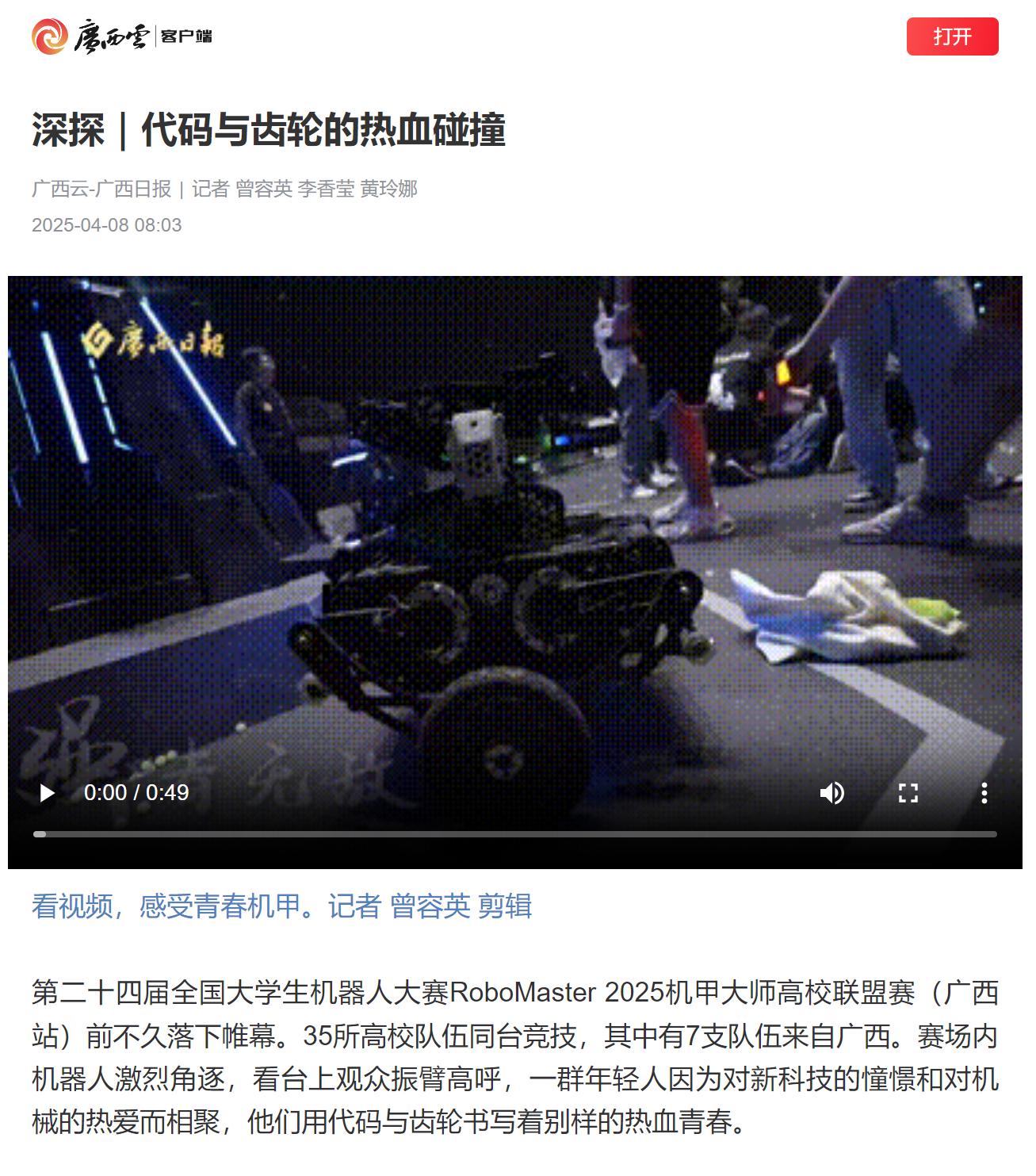 第二十四届全国大学生机器人大赛RoboMaster 2025机甲大师高校联盟赛(广西站)前不久落下帷幕。35所高校队伍同台竞技,其中有7支队伍来自广西。赛场内机器人激烈角逐,看台上观众振臂高呼,一群年轻人因为对新科技的憧憬和对机械的热爱而相聚,他们用代码与齿轮书写着别样的热血青春。