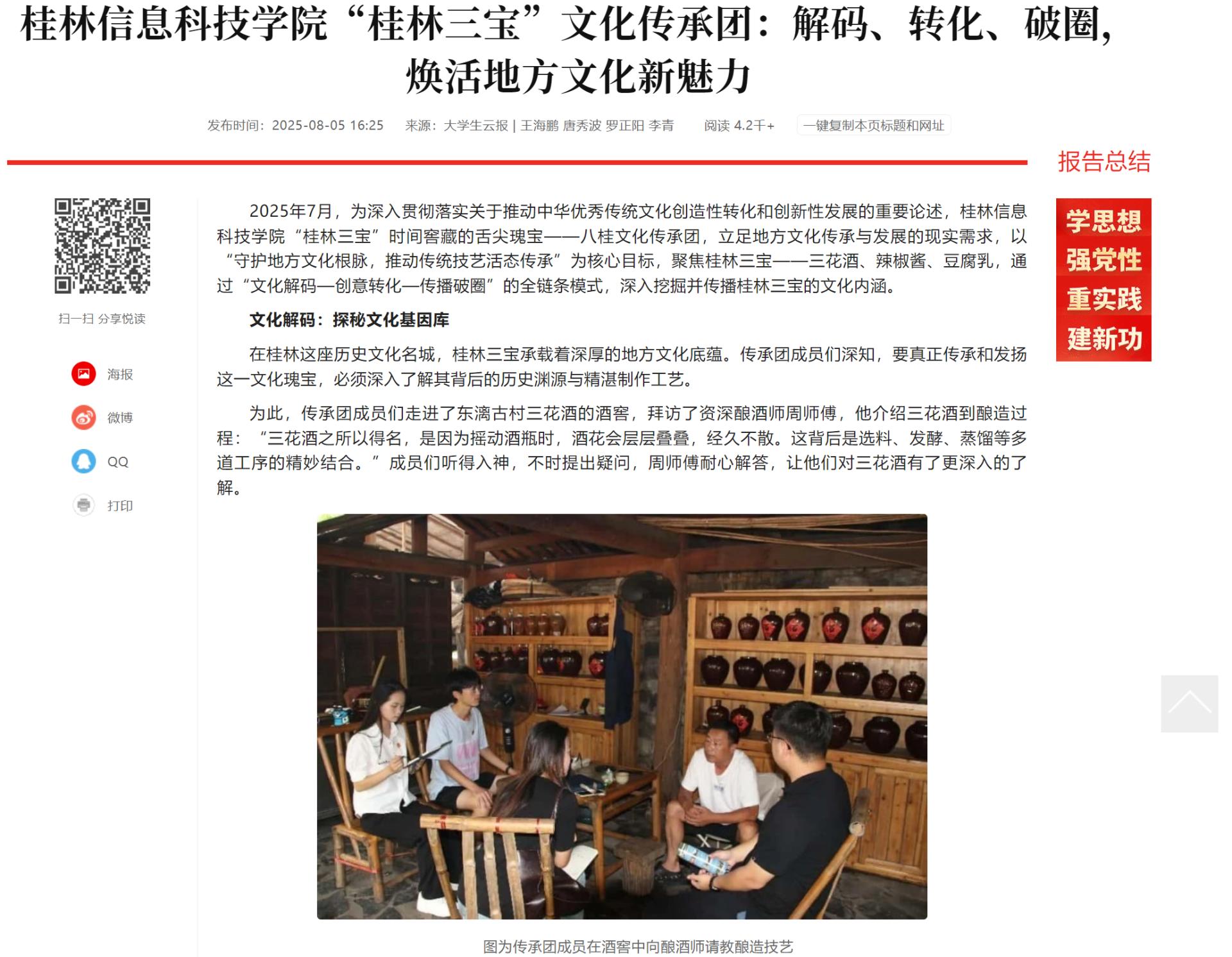 2025年7月,为深入贯彻落实关于推动中华优秀传统文化创造性转化和创新性发展的重要论述,beat365在线唯一官网“桂林三宝”时间窖藏的舌尖瑰宝——八桂文化传承团,立足地方文化传承与发展的现实需求,以“守护地方文化根脉,推动传统技艺活态传承”为核心目标,聚焦桂林三宝——三花酒、辣椒酱、豆腐乳,通过“文化解码—创意转化—传播破圈”的全链条模式,深入挖掘并传播桂林三宝的文化内涵。