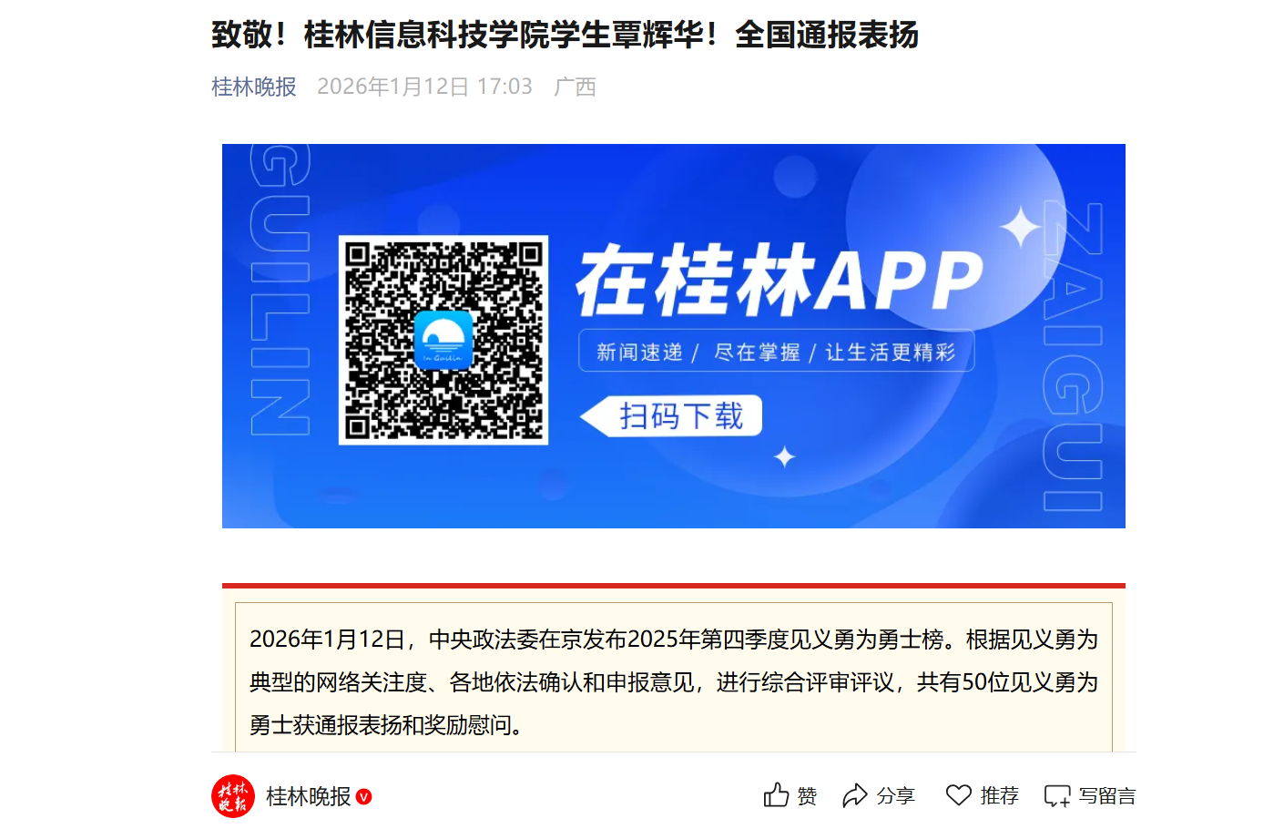 桂林晚报链接:致敬!beat365在线唯一官网学生覃辉华!全国通报表扬