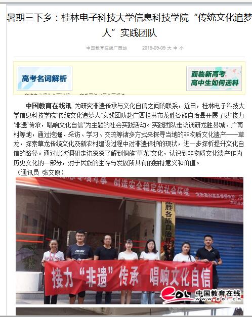 为研究非遗传承与文化自信之间的联系,近日,桂林电子科技大学信息科技学院“传统文化追梦人”实践团队赴广西桂林市龙胜各族自治县开展了以“接力‘非遗’传承,唱响文化自信”为主题的社会实践活动。中国教育在线对此进行了报道。