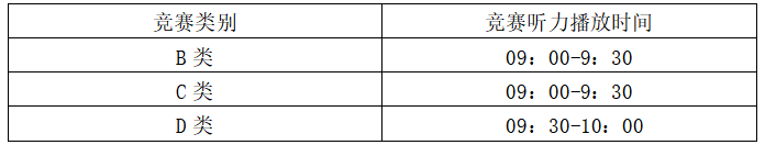4.B类竞赛的听力音频由监考员在语音室内播放,C类、D类竞赛由学校多媒体教室广播系统统一播放,无需自带耳机和收音机。具体放音时间如下: