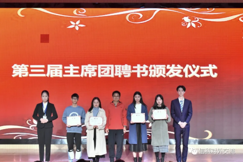 紧接着,今晚的第二场重头戏:国际交流协会第三届主席团及部长聘书颁发仪式开始啦!由赖安、韦春宇两位指导老师亲自为他们颁发聘书,随后“咔咔咔”地留下了美美的合照哦!