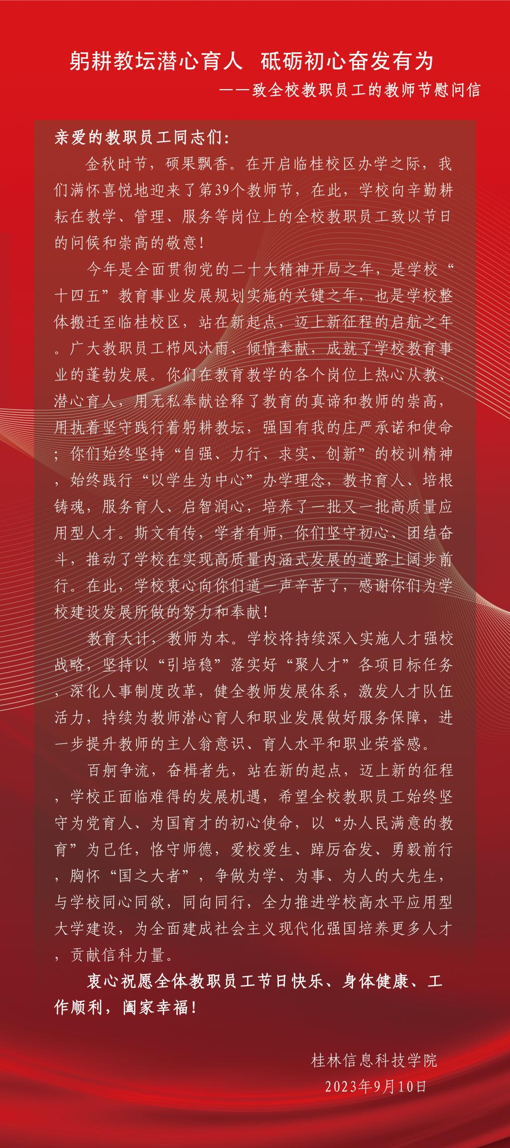 躬耕教坛潜心育人,砥砺初心奋发有为——致全校教职员工的教师节慰问信