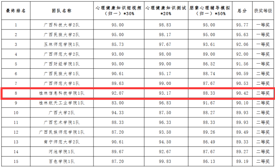 近日,由广西壮族自治区教育厅主办、广西财经学院承办的全区高校大学生朋辈心理辅导技能大赛圆满结束。经过激烈角逐,由学校老师王利南、冀艳玲和罗慧芳指导,学生刘冲、周海婷和王永杰组成的队伍荣获本次大赛的二等奖。
